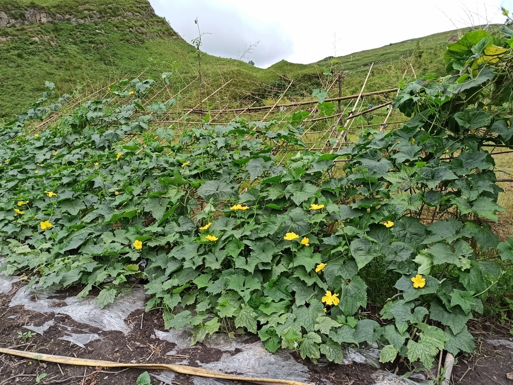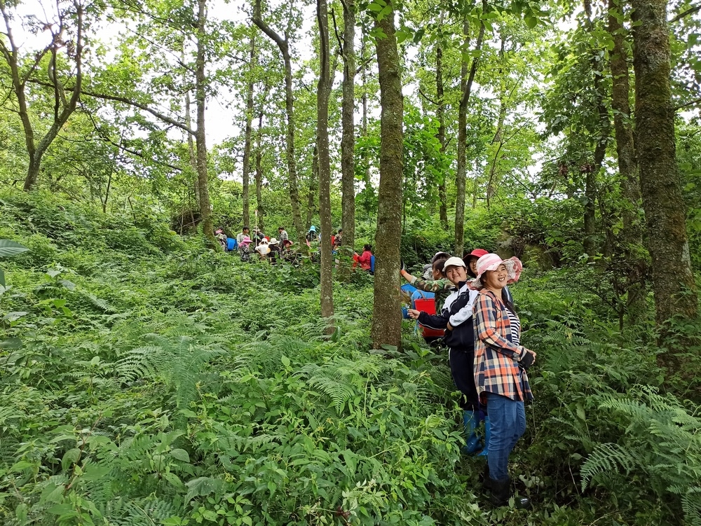 我们排成了长长的队伍,行走在蜿蜒的羊肠山路上,穿梭在茂盛的树林草丛中。今日天色有些阴沉,一会儿便沥沥淅淅下起了小雨,但依然阻挡不了大家前行的脚步。走着走着,沿途还发现一块不知是谁人种的玉米地,要说这雨来得快去得也快,很快便雨过天晴露太阳了。我们找到一棵挂满了大小不同的猕猴桃树,瞬间欣喜若狂连忙开始采摘, 仙子们有的爬到树上摘,有的举着自制的长钩子摘,仙女们有的在低处摘,有的往背篓里放果实,不时还上演一出“天(树)上掉下个猕猴桃”,场面十分有序又有趣。