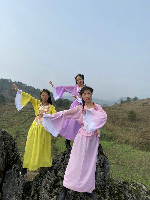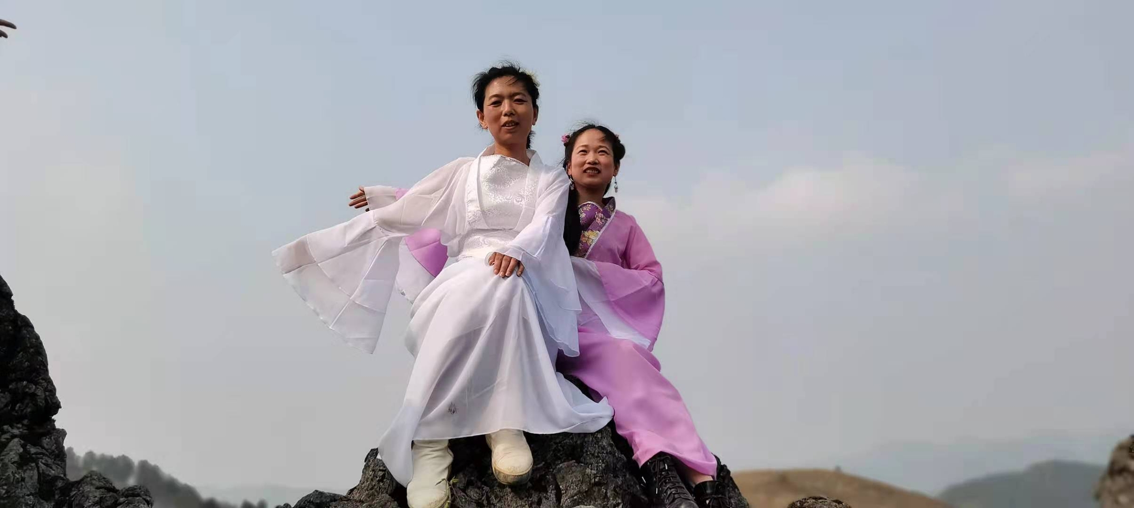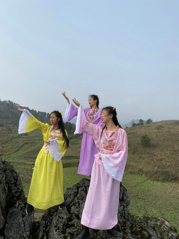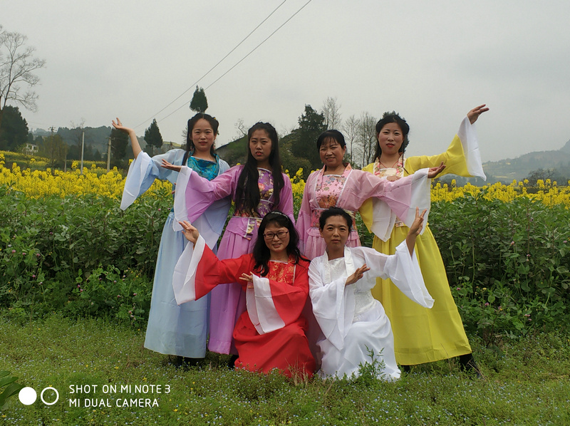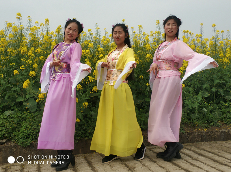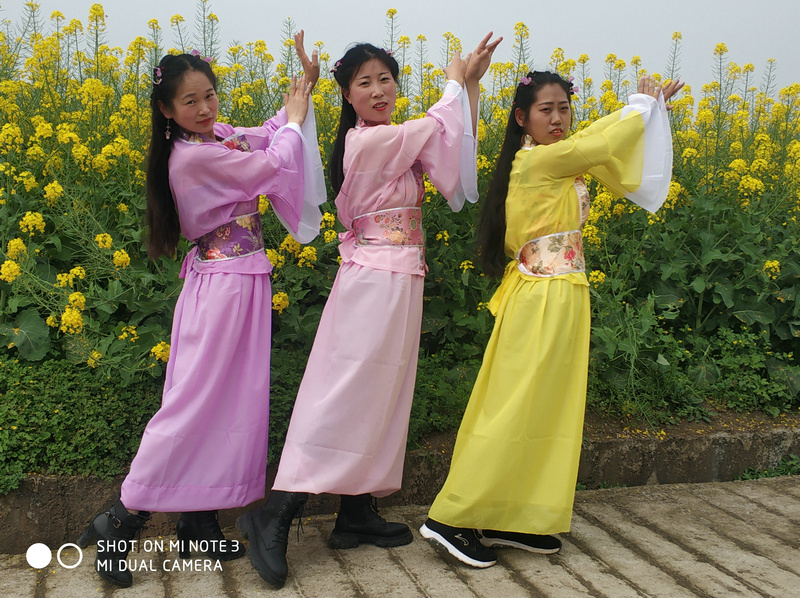 The heavenly maidens fly from the Heavens, Their robes of azure mist swaying as they dance through the clouds, With crimson sleeves and a fragrance of purity, they move with grace, Their rainbow-colored garments fluttering like silk, creating a vibrant bridge in the sky. They seek spring, walking along the song-filled ridge, Their light songs and graceful dances treading on the shadows of flowers, The flower-lined paths are fragrant with blossoms in full bloom, Their delicate scents spread, filling the air with clarity and purity.
