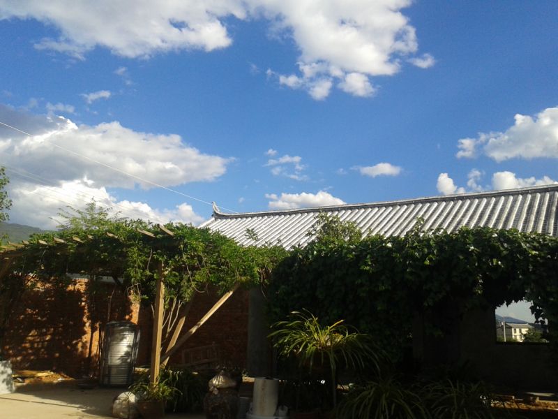 Please enjoy the blue sky, white clouds, and the style of several builders at the tourism campsite