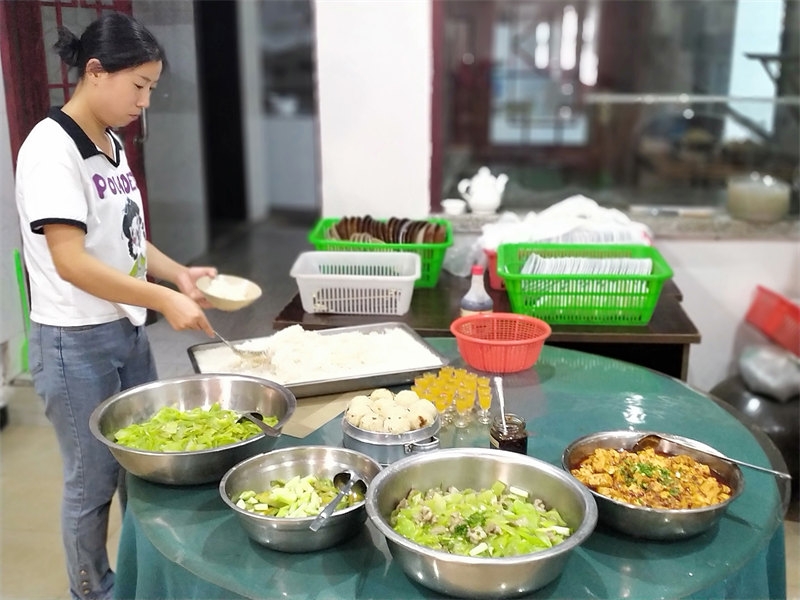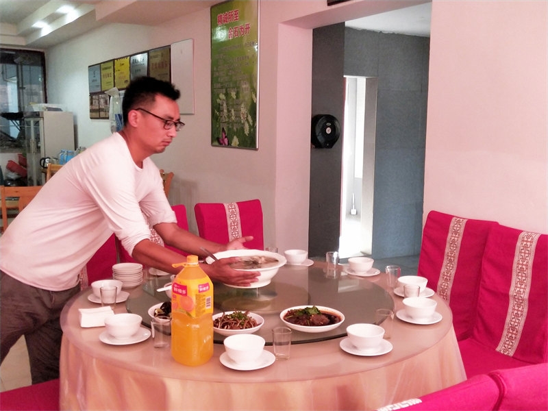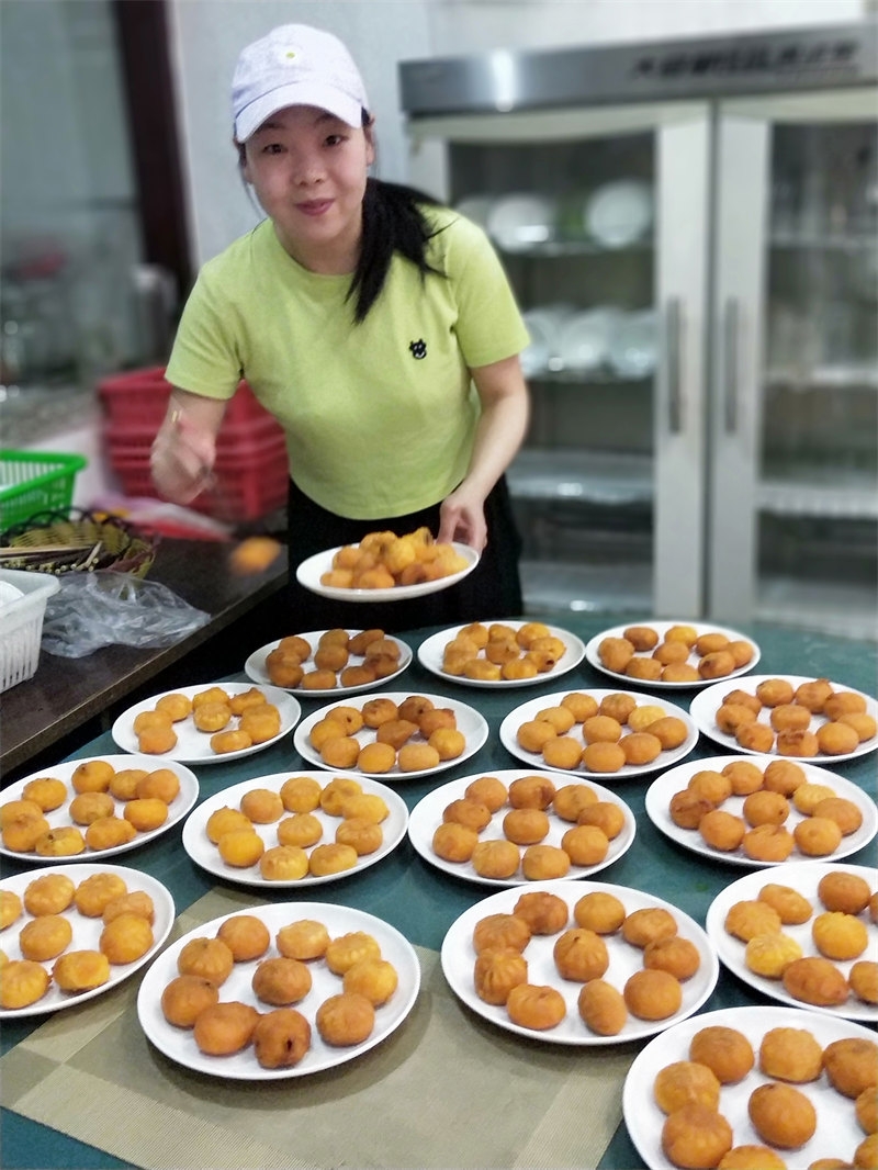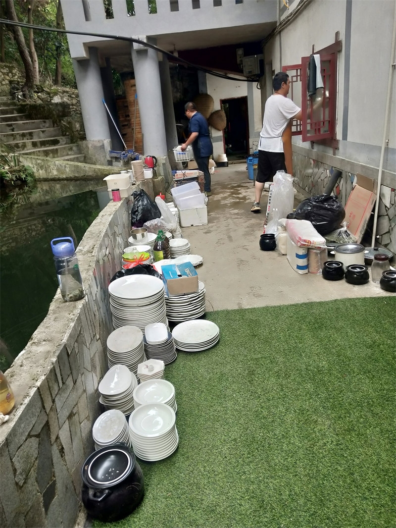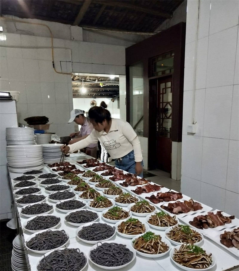 On June 10th, we received a booking for a 22-table lunch, plus an additional dozen tables for dinner, celebrating a 60th birthday. Each table seated 10 people, with more than 200 guests attending. The menu was diverse, and from the moment breakfast was finished, we began preparing vegetables and cooked dishes. It was an all-hands-on-deck situation, with everyone coordinating their tasks, bustling about in joyful collaboration. Running our own farmhouse inn means that everyone is both an owner and a server. Some curious guests asked, "It looks like a family business, right?" Though we didn’t introduce ourselves as such, they could clearly see the camaraderie. It was our first time handling such a grand banquet scene, and the whole day was lively and exciting. Everyone was enthusiastic, working together smoothly, and we completed the event successfully. Some of the brothers and sisters had already helped with a 38-table lunch banquet before we arrived, so compared to that, this felt like a smaller challenge.