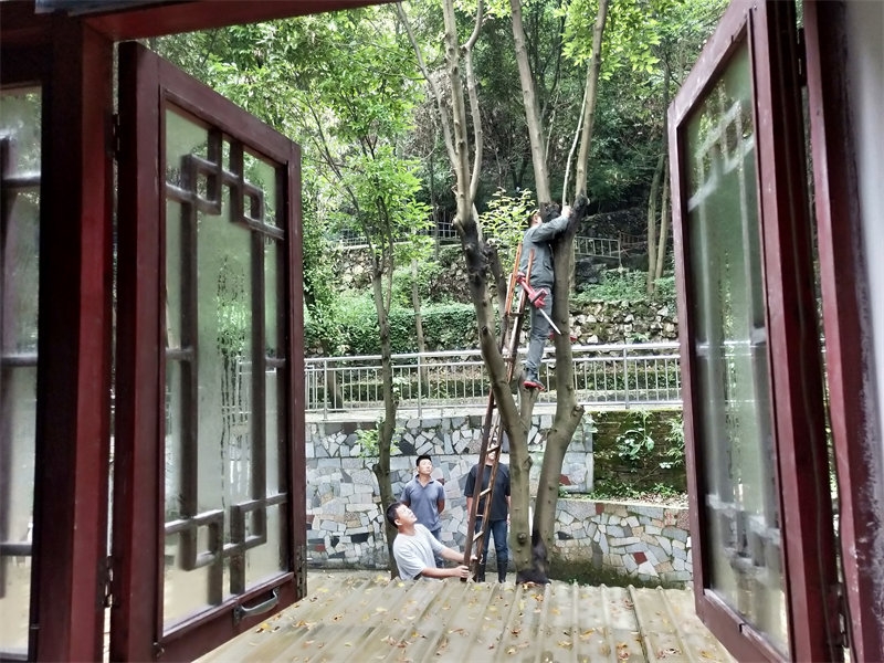 They are cutting down a tree that was growing inappropriately, redoing the surrounding ground, and creating a drainage ditch.