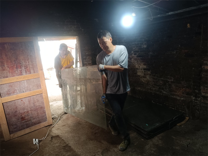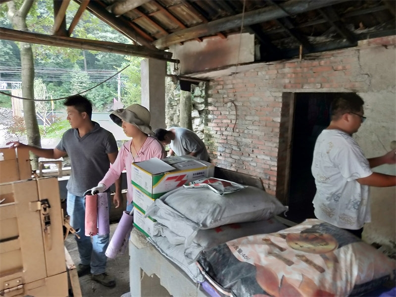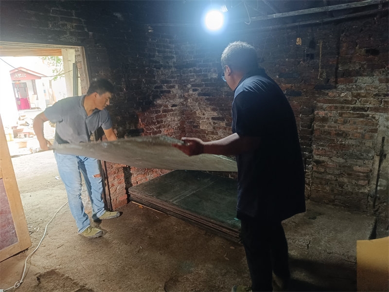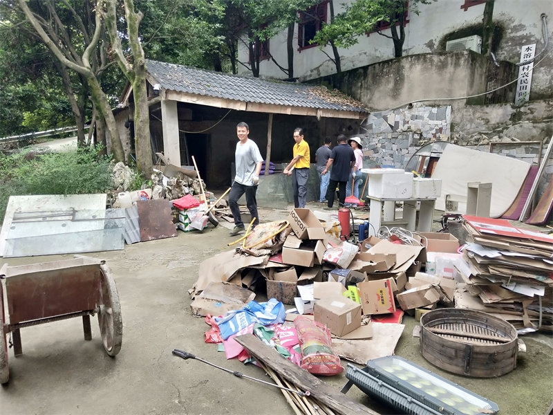 They are organizing a storage room filled with cardboard boxes and various items. It was so cluttered before that no one could even walk in.