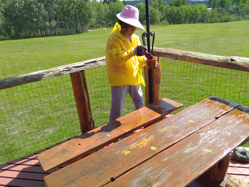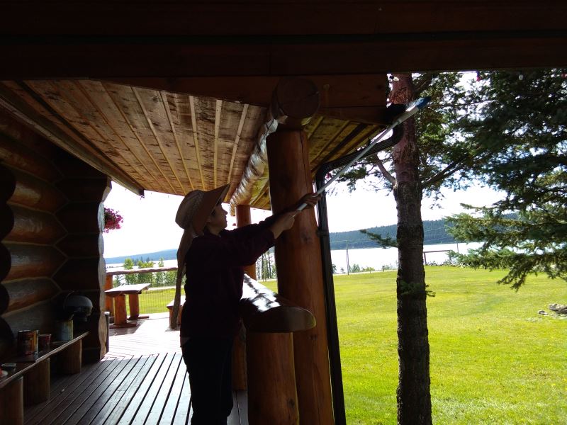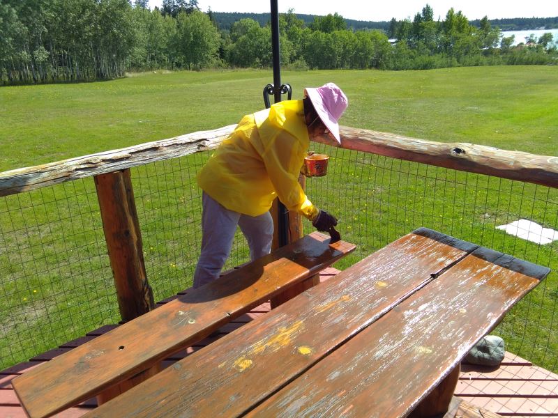 Three ladies are starting to work on painting, preparing to re-paint the exposed wooden surfaces.