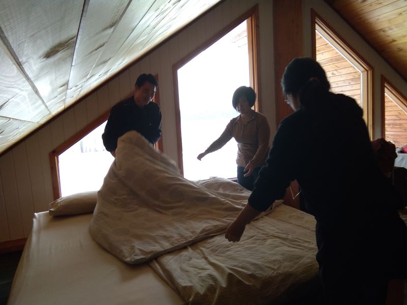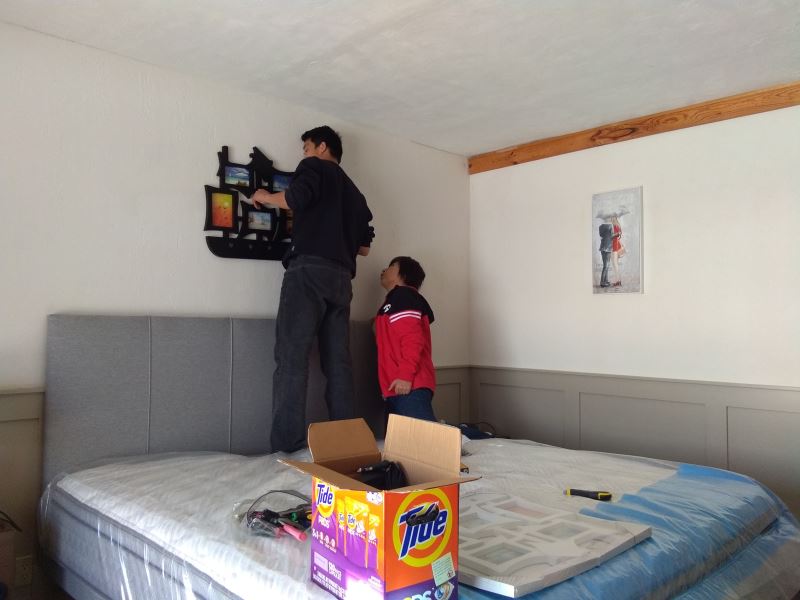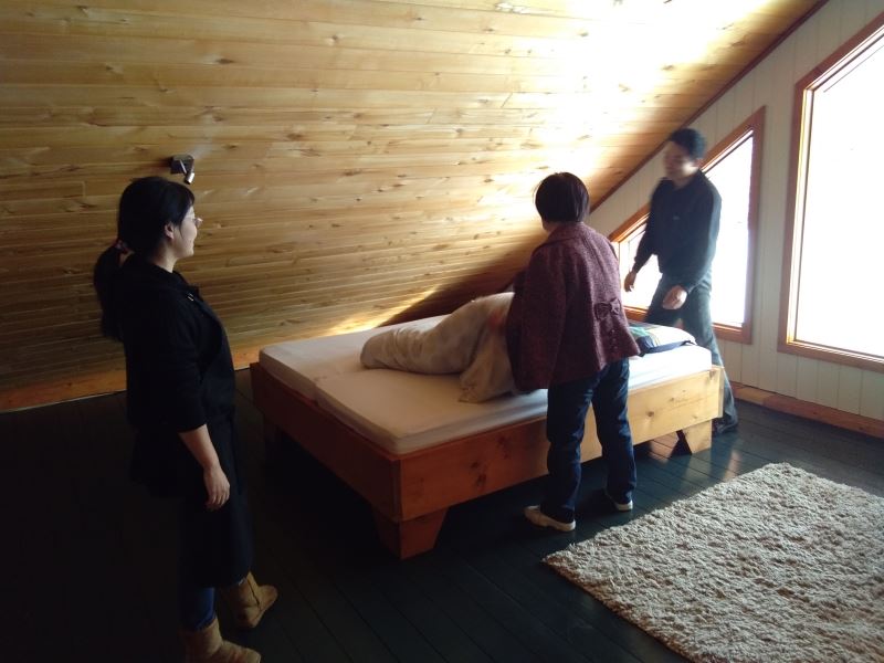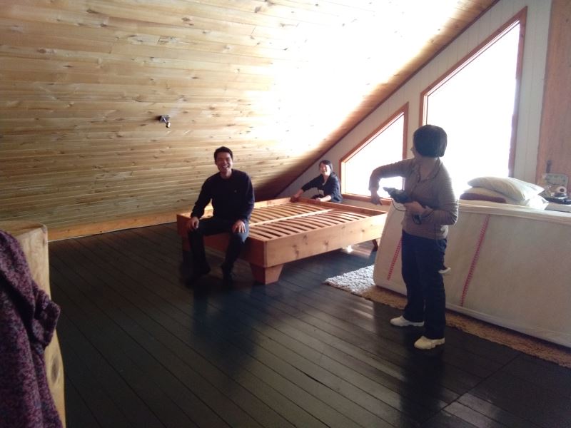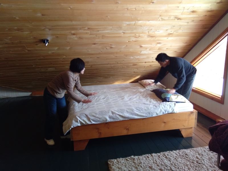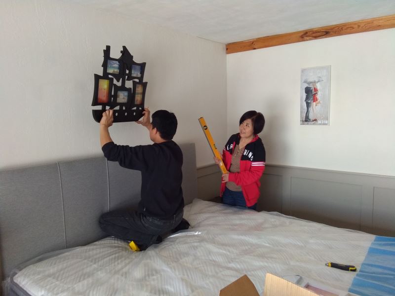 I've started decorating the guest rooms! Two rooms have double beds, and four rooms each have two single beds. The beds are of high quality, and the bedding is top-notch. The walls are adorned with artwork. In the double-bed rooms, the walls feature 3D images of a couple in love, which might inspire some romance for those staying there.
