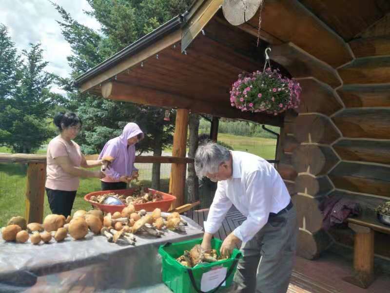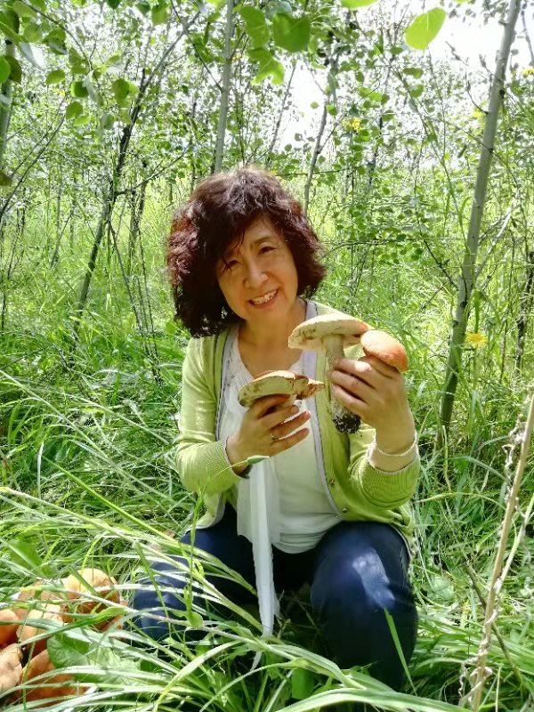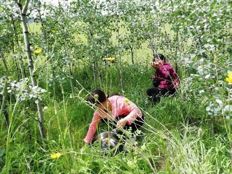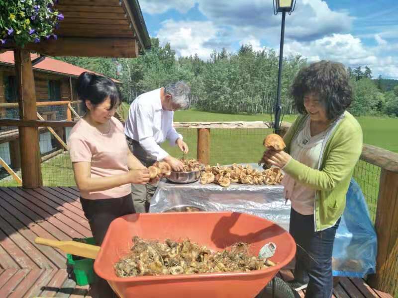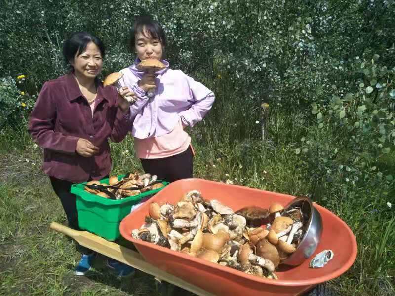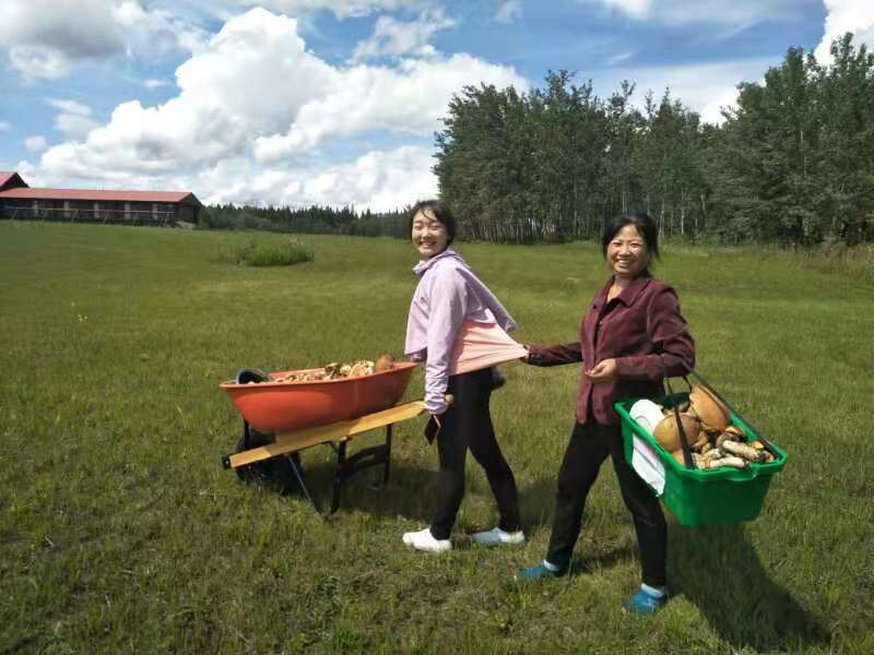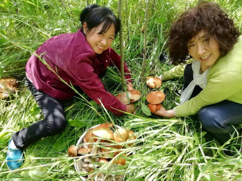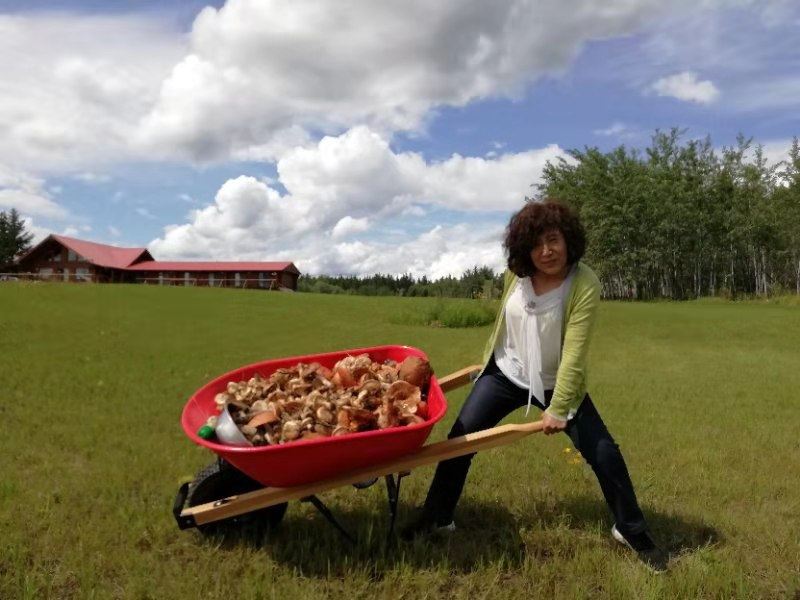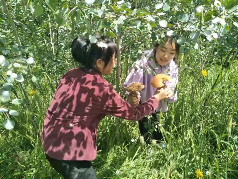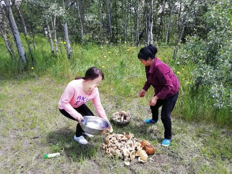 Today, we discovered a new treasure right here in the Oasis. After breakfast, the four of us went to Baili Village for some errands and checked out a local shop to see if there were any treasures to be found. We ended up finding a kettle and a few small plates. Upon returning, Fairy Ehuang took some leftover bread from the guests, tore it into pieces, and went to the edge of the forest to feed the birds. To our surprise, she found mushrooms in the forest. As we walked along the edge of the forest towards the poplar trees near the road, we were amazed to discover a large patch of mushrooms on the grass. Fairy Ehuang came back excitedly, out of breath, and said, “Mushrooms, mushrooms, a whole patch of mushrooms!” Fairy Xinrui and Fairy Ehuang went to gather the mushrooms, but one basket wasn’t enough. Ehuang went back to get another basket, saying there were too many mushrooms, and asked Fairy Xinrui for help. Hearing about the abundance of mushrooms made me eager to join in. Oh my! Two baskets were still not enough, so we found a food crate, but it was still not enough. Eventually, Fairy Xinrui brought out the small cart to collect the mushrooms.