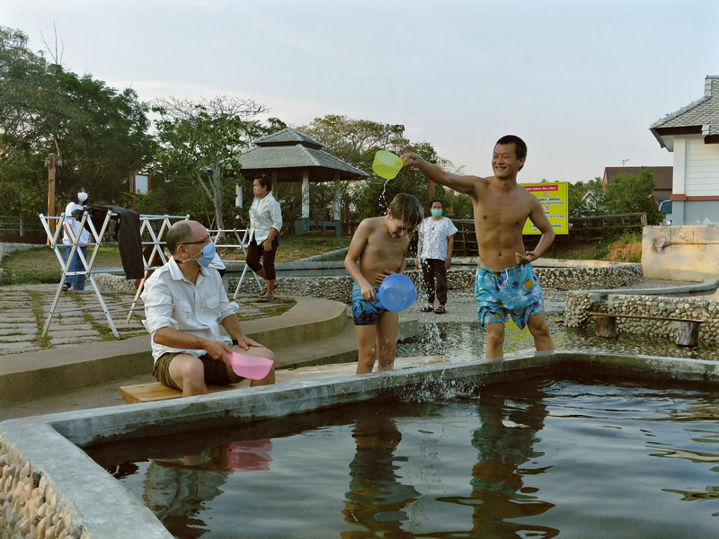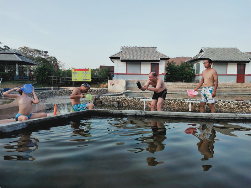 Understanding their wish to relax and enjoy their travels, Huiyi and the community arranged a few outings during their stay. On the first day, they visited a local temple. The second day was spent exploring the nearby King’s Park. On the third day, they ventured to Tad Mork Waterfall, a serene and picturesque jungle waterfall about a half-hour drive from the community. The lush, pristine forest, filled with blooming datura flowers, provided a stunning natural backdrop, and everyone felt a joyful and peaceful energy during the visit. They also experienced the village’s famous hot springs, a favorite among our volunteers. The springs are well-maintained by the local Thai community, with several pools offering different water temperatures. It’s a refreshing and free experience, leaving the skin feeling smooth and rejuvenated.