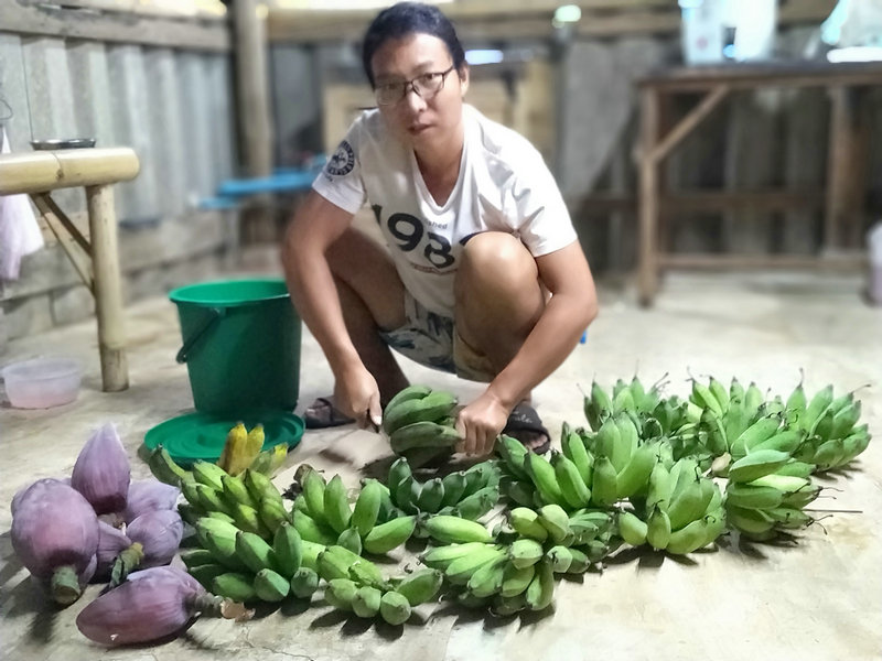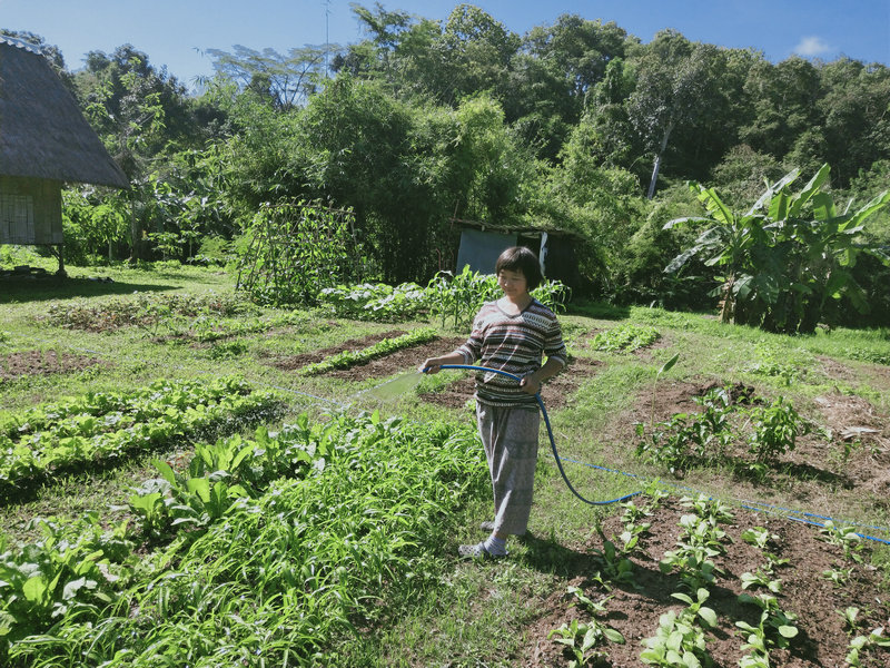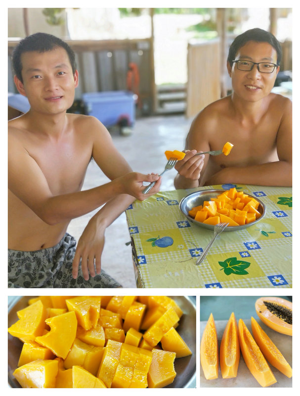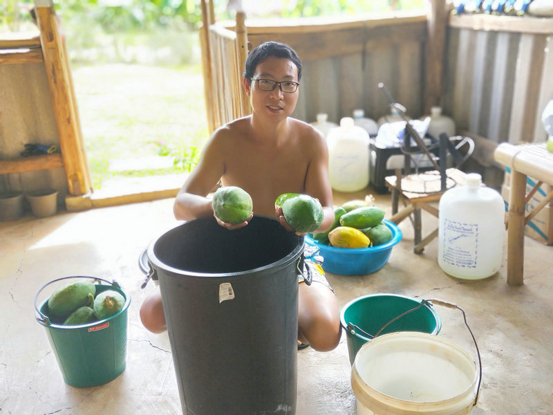 Currently, our main vegetables include papayas, banana flowers, and a continuous supply of various leafy greens. Additionally, a few previously planted eggplants are thriving and, with a bit of extra nutrition, have generously surprised us with their harvest. The vegetables we grow are entirely free of chemical fertilizers and pesticides, relying only on homemade urea, compost, and an organic liquid fertilizer (made from a mixture of banana stalks, molasses, and water). These are truly pure, organic vegetables. Some vegetables, however, are particularly attractive to pests, so we’ve taken some tips from YouTube gardening videos and started spraying a mixture of white vinegar and dish soap on the leaves of certain crops, such as using it to manually remove caterpillars from the corn leaves.