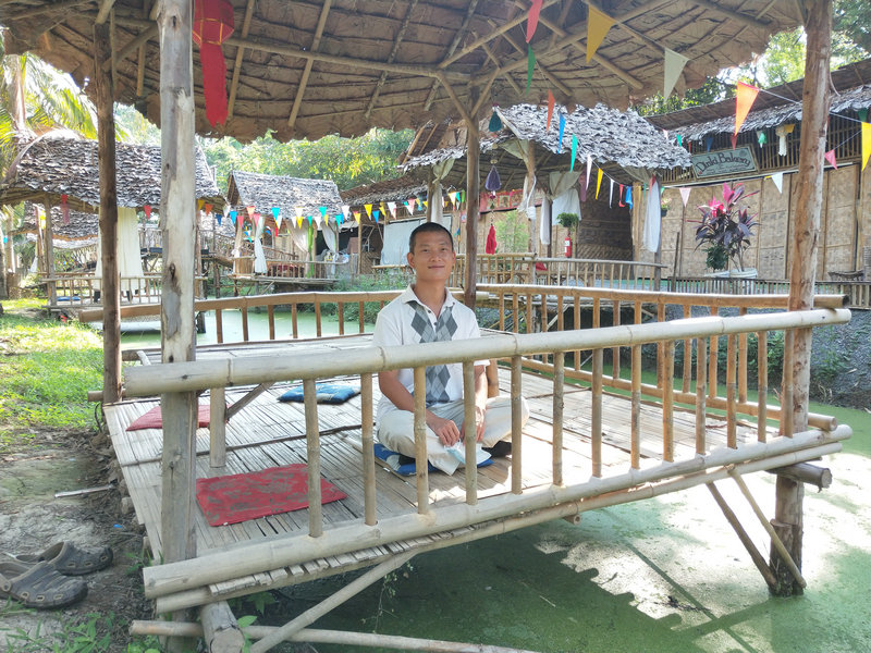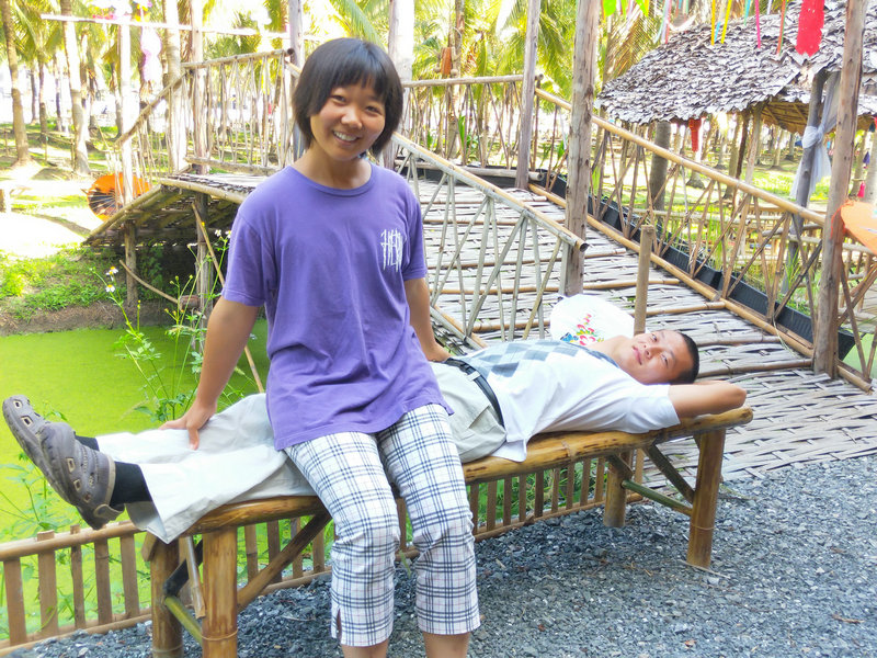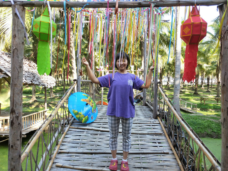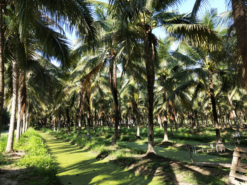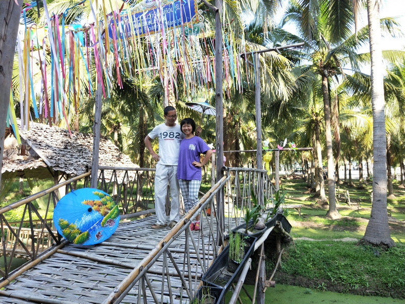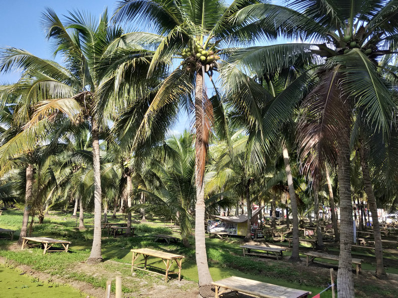 During the day, we visited a coconut market, though we arrived just after it had closed. Despite this, the area felt serene and natural, with rows upon rows of tall coconut trees bearing an abundance of fruit. It was the first time we had seen such a vast and impressive coconut grove, exuding the tropical essence of the southern region. The bamboo pavilions and intricate decorations added to the unique character of the place.