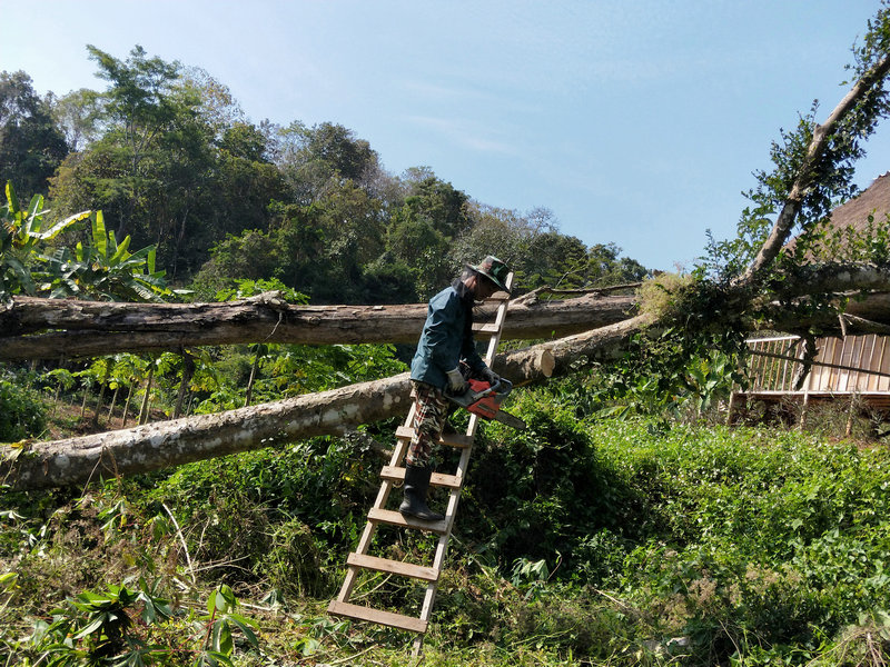 Last year, two large trees suddenly fell during the night. Interestingly, they fell in such a way that they narrowly missed the house where Huiyi was staying, almost as if by design. It was clearly divine protection. During this dry season, we had some free time to clean up the area and gather more firewood. I noticed something intriguing about these two trees. They reminded me of the phrase, “In the heavens, may we be birds flying wing to wing; on earth, may we be branches growing together.” The trees were tightly intertwined as they grew, as if to live and fall together, truly embodying the idea of life and death shared. Whether this is good or bad remains to be seen. According to the enlightenment from the guide's writing, "Embracing life but hard to bear fruit," it seems that maintaining individual independence is better for peace and growth. Indeed, cultivating a complete and independent consciousness is essential for the higher evolution of life. Even after they fell, these trees did not give up on growing; they remain vibrant and full of life, once again demonstrating the incredible resilience of nature.