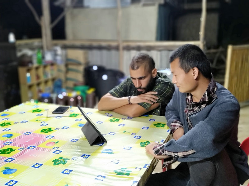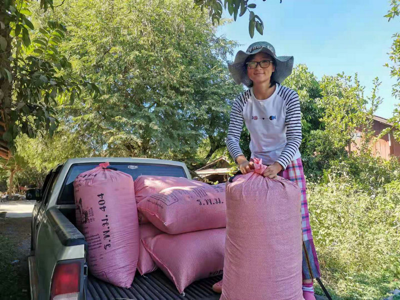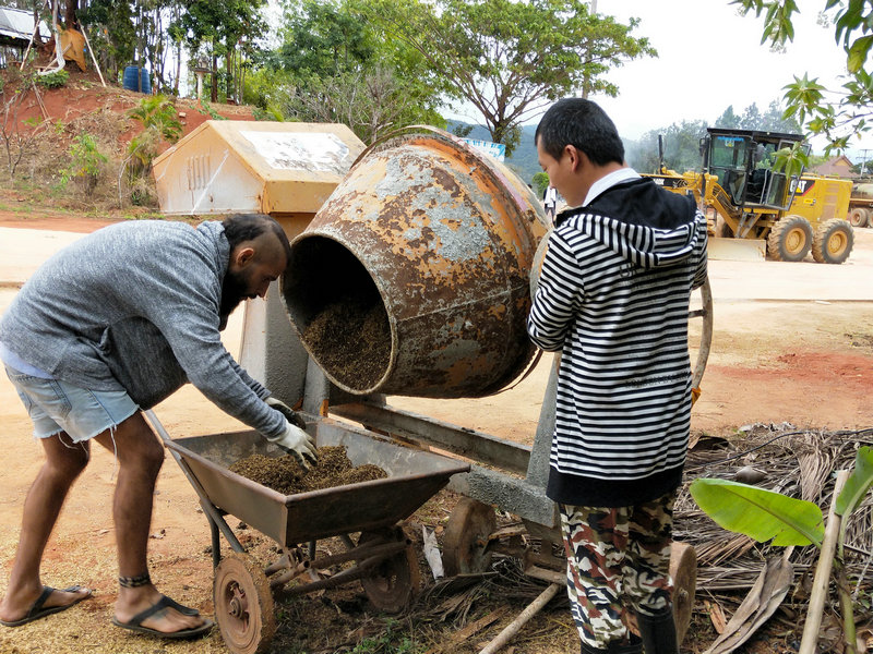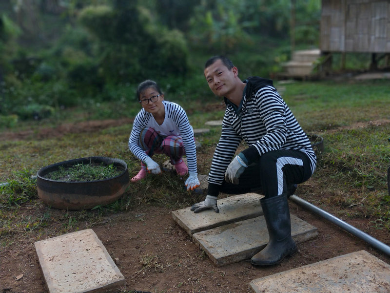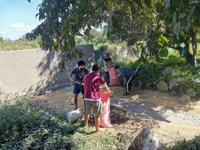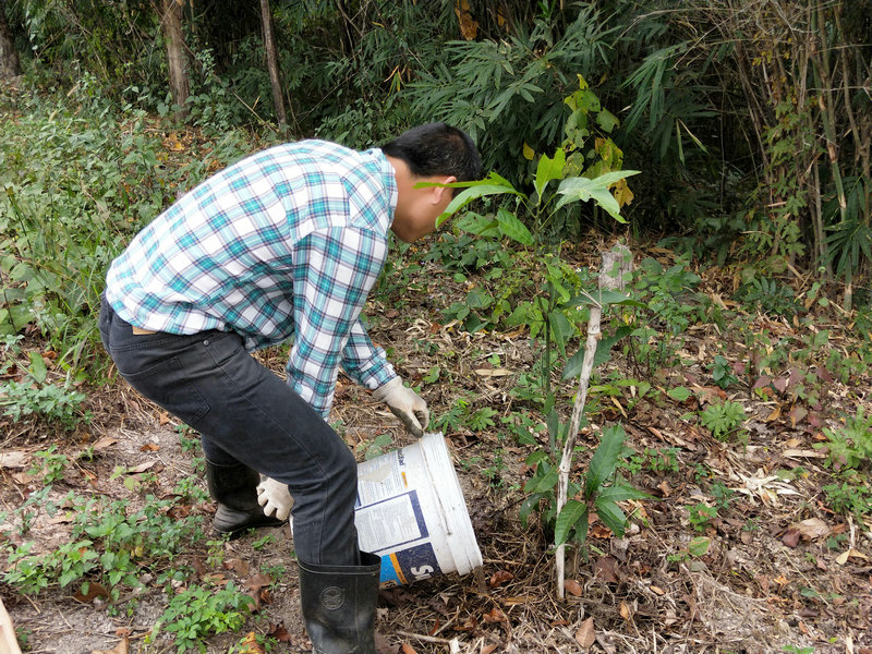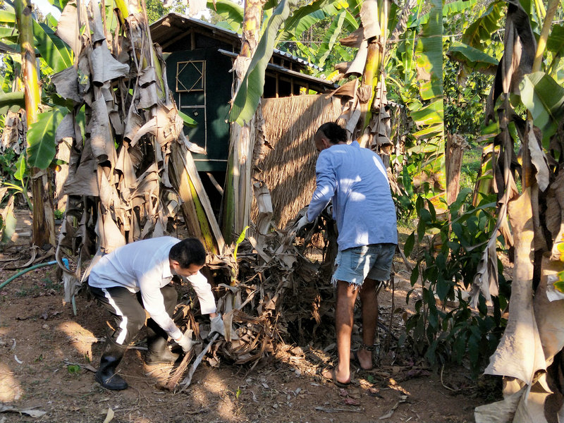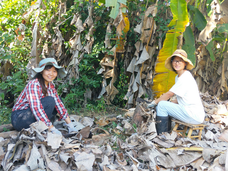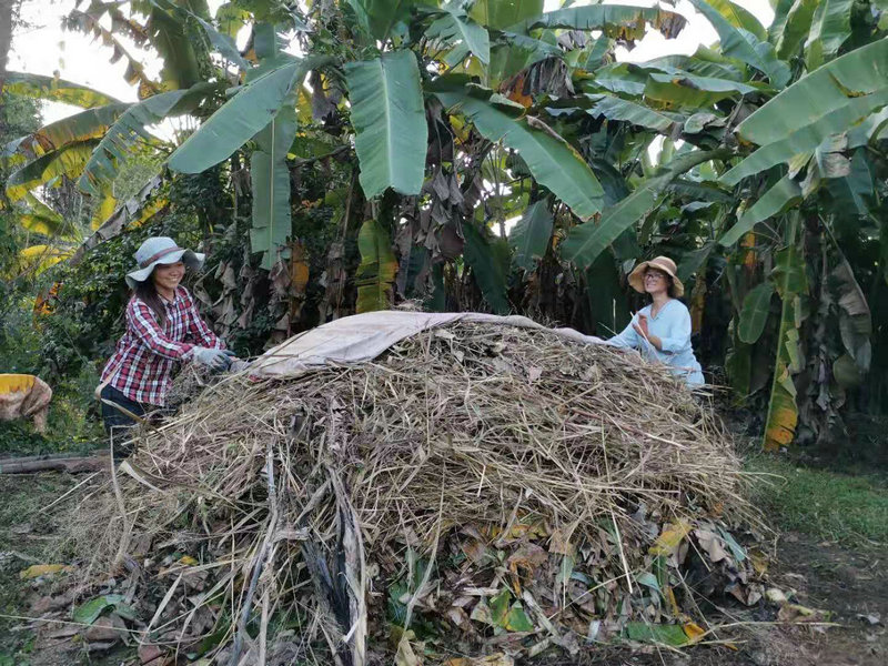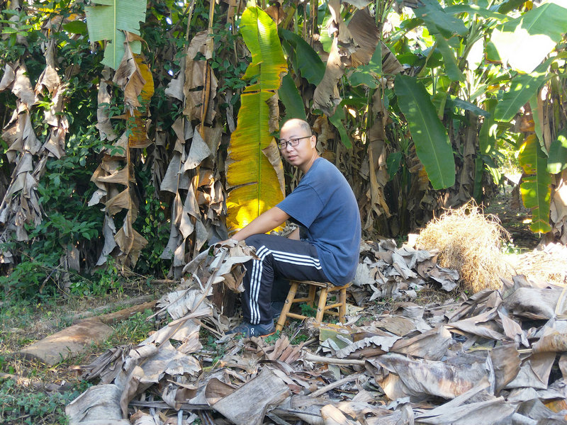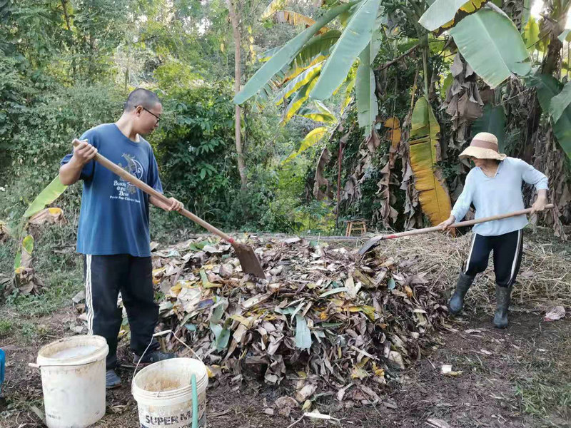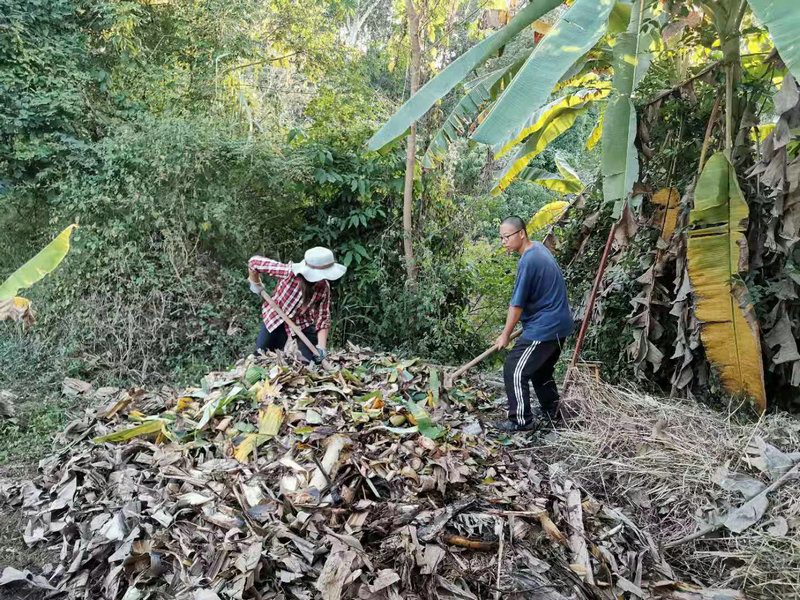Recently, Guangge and I worked together to create organic compost using banana stalks. We used the dried branches, leaves, and some of the non-fruiting tree trunks from the banana plantation that Guangge regularly prunes. After cutting everything into small pieces, we mixed them with dry grass that Huiyi had cut and added some water and homemade urea enzyme. The compost is now ready and should be well-fermented in about one to two months.