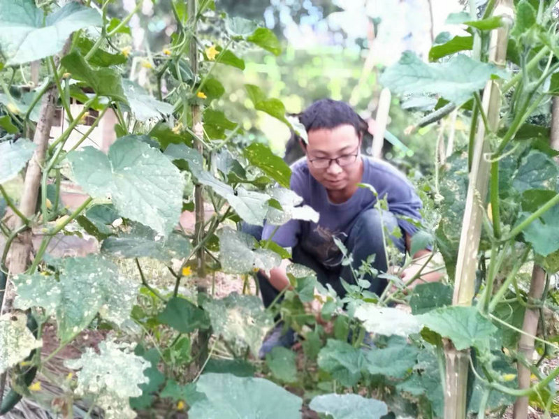 Brother Huiyi has quietly taken on much of the beautification work both on and off the mountain. Carrying a weed cutter, he tirelessly battles the resilient weeds, tending to every corner and detail of the garden until everything is neat and orderly. Walking on the lush green lawn often brings a sense of comfort and ease. Nicknamed "All-Powerful Brother," Guang not only demonstrates his extraordinary skills in repair and production but also has a knack for gardening. The gourds, cucumbers, and eggplants he manages are all thriving with vitality. Even the strawberries, under his gentle care, have shyly begun to blossom.