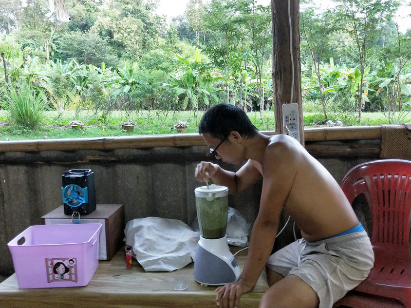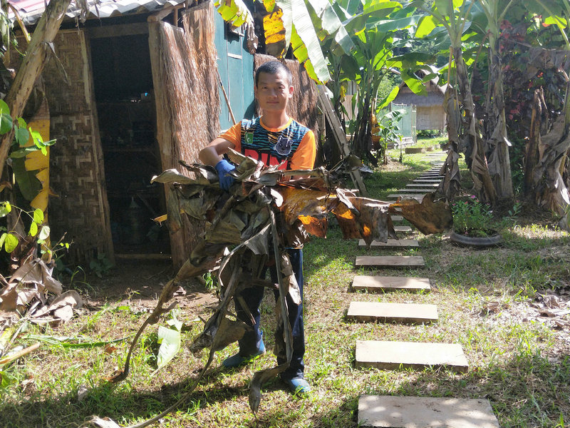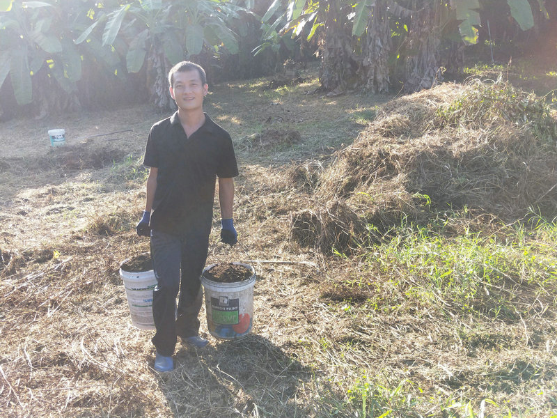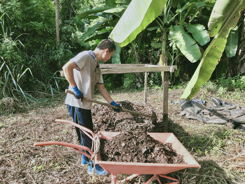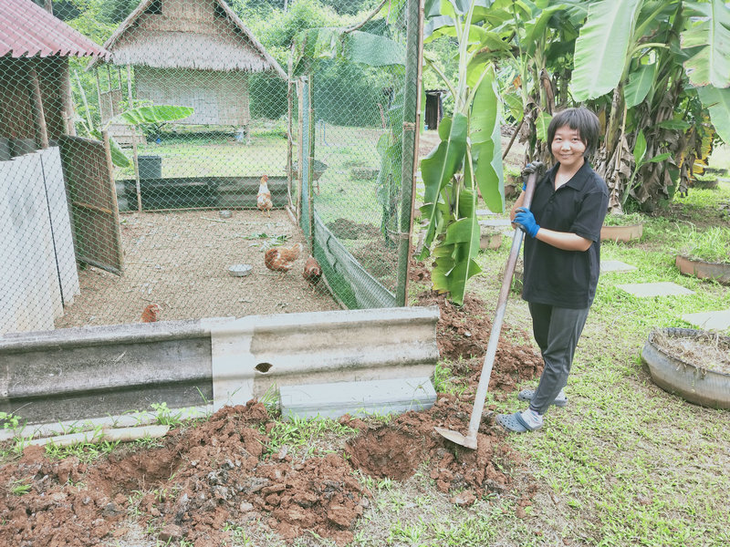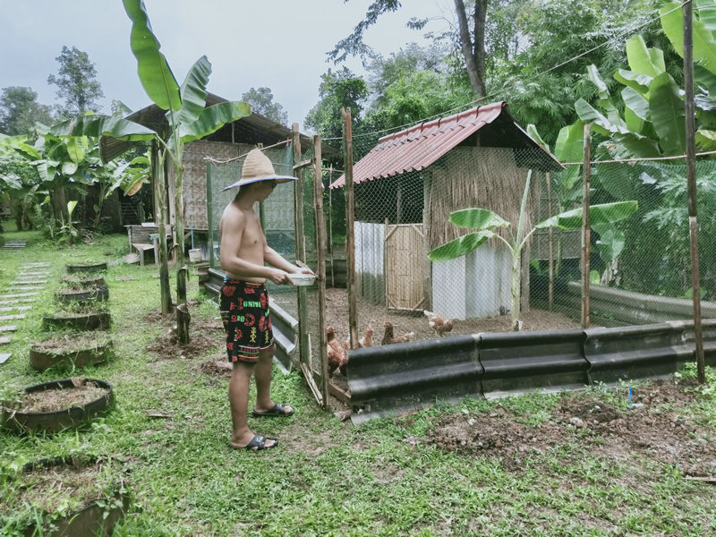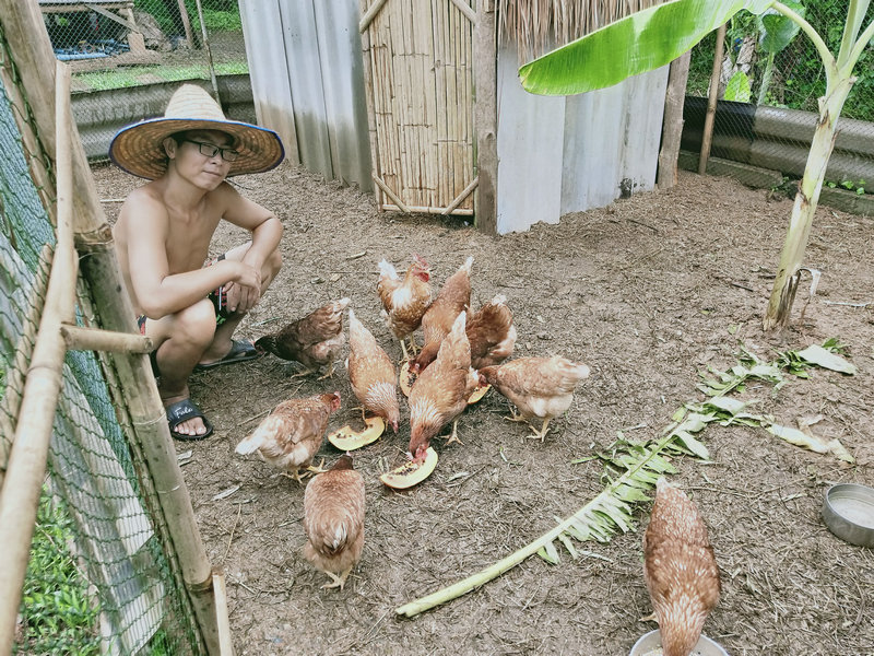 Guang is a true craftsman, skilled at both thinking and creating. Recently, he’s designed a clothes-drying rack, renovated steps, repaired the laundry room floor, maintained the rainwater filtration system, made dish soap, mosquito coils, cutting boards, and tools like forks and sickles for the garden. Whenever something needs repair or construction, whether it’s houses, furniture, or basic facilities, Guang is the one to call, making life more convenient and comfortable. The chickens are fortunate to have Guang taking care of them daily. He studies their preferences and needs, providing a diet of crushed corn and rice, along with fruits and vegetables like papaya, bananas, and various leaves. Concerned about them getting too hot in the sun, he planted three banana trees near the chicken coop, and following his suggestion, we planted some vine crops around the area to provide shade and add to the scenery.