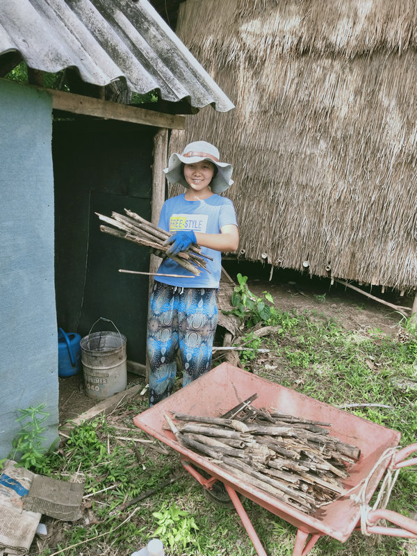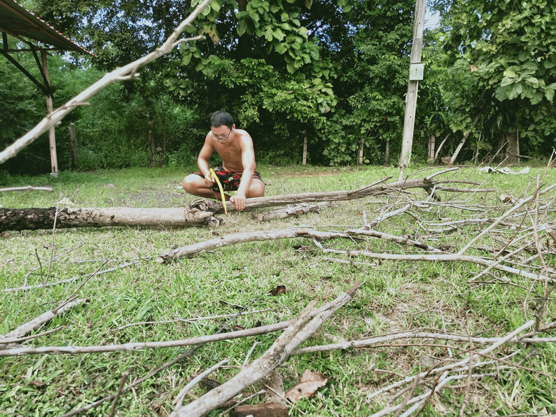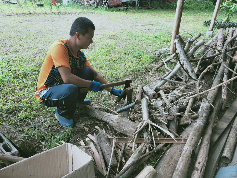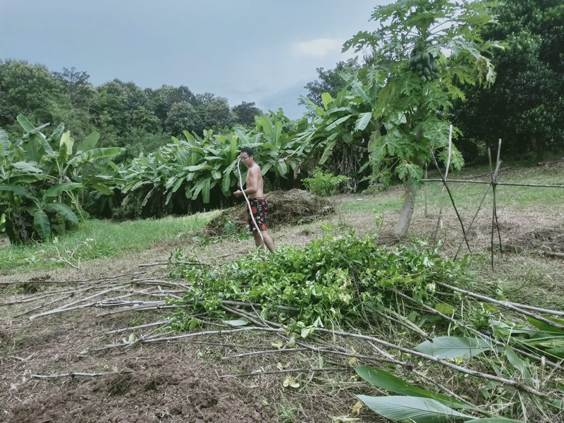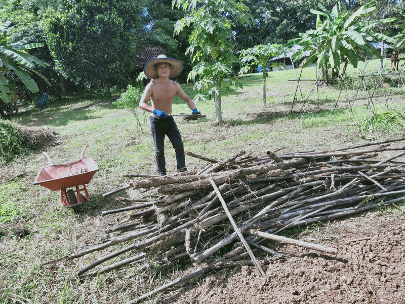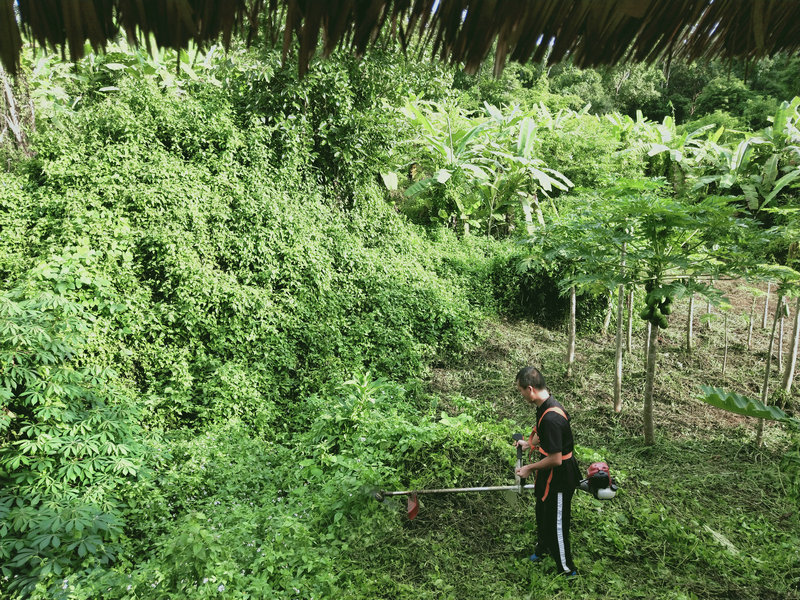 Without realizing it, a month has passed since my return. Let's see what Huiyi has been up to. He often carries a lawnmower, moving around the garden's inside and outside, both uphill and downhill, like a soldier on the front lines. His appearance is particularly dashing, and he works up a sweat every day, clearing bushes and weeds, and attending to the finer details. Since the grass hadn't been cut for months, he's now tasked with tidying up the entire hillside. I truly admire his perseverance in continuously mowing the grass. Huiyi is quite busy, often needing to handle external affairs, process visas, or make purchases. Sometimes, he helps Guang with construction or assists me with tilling the land and planting vegetables. He even thoughtfully prepares plenty of firewood and brings it to the kitchen, which warms my heart.