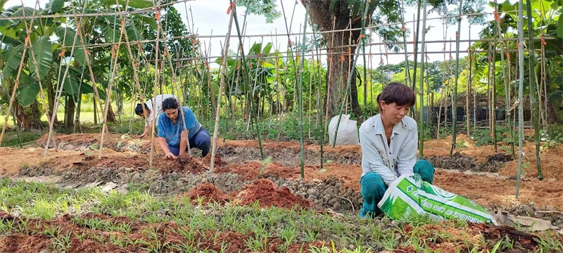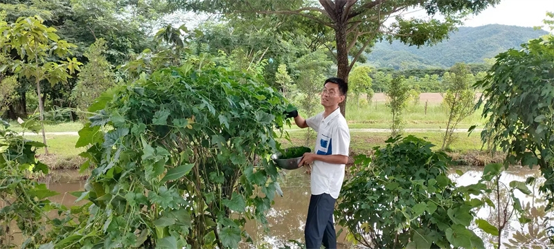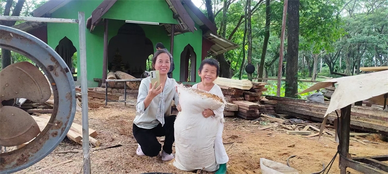With childlike enthusiasm, two children, Jie Jing and Yu Lin, followed the distant sounds of cows to discover a cattle farm near the mango grove. Using translation software, the residents of the mango grove had a friendly and pleasant conversation with the farm owner. They mutually visited each other’s farms and orchards, sharing knowledge about planting and their harvests. Jie Jing and Yu Lin confidently went to visit the orchard of the farm owner located in Fang, while the farm owner’s friend came to Gongde Garden to meet us. During a conversation with this kind sister, Yang Le asked about and learned about the possibility of raising sheep in Thailand.