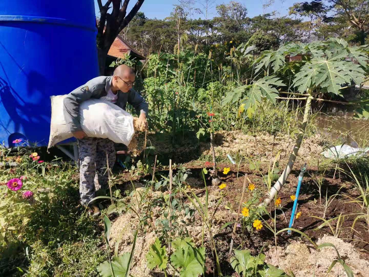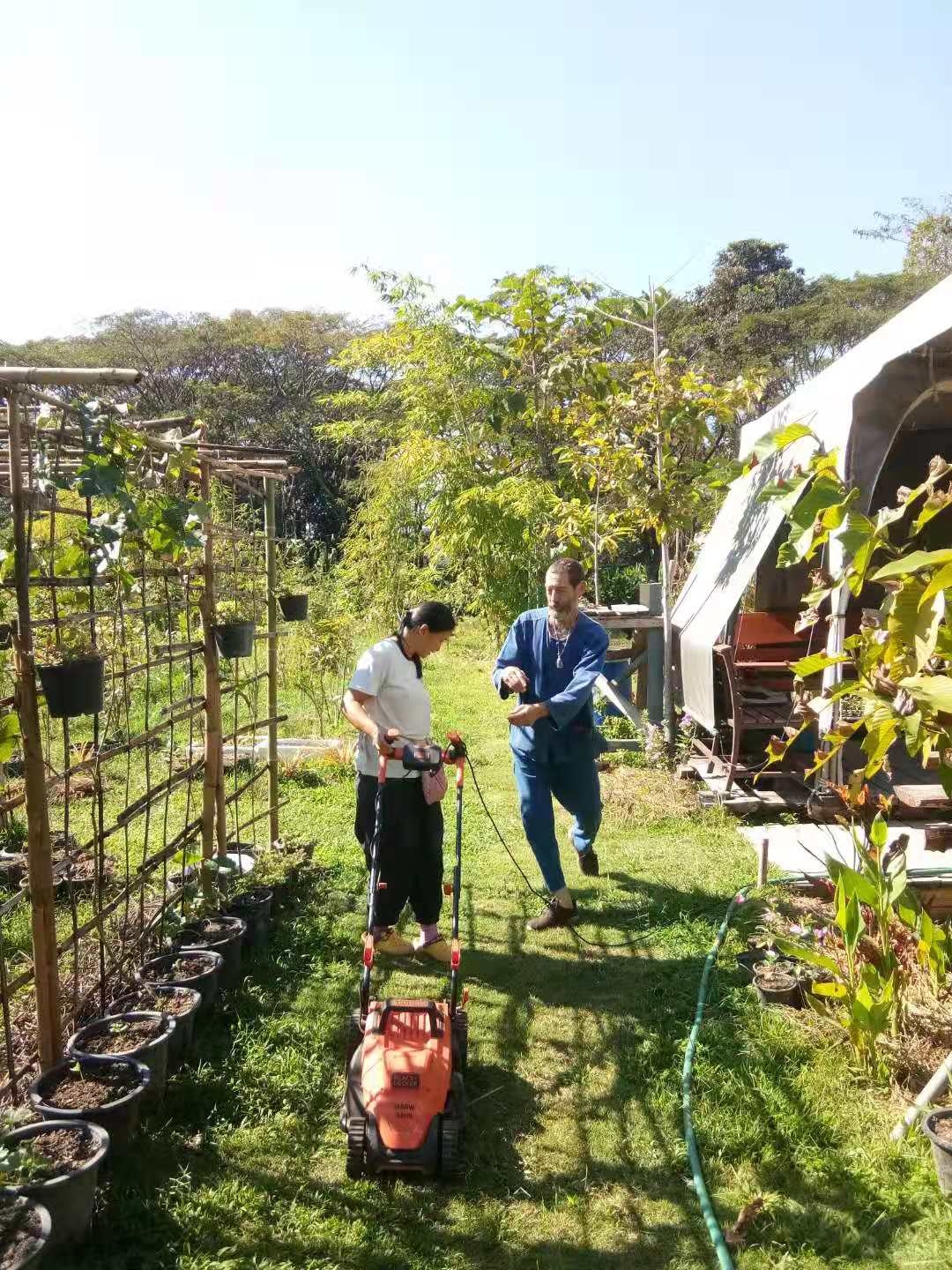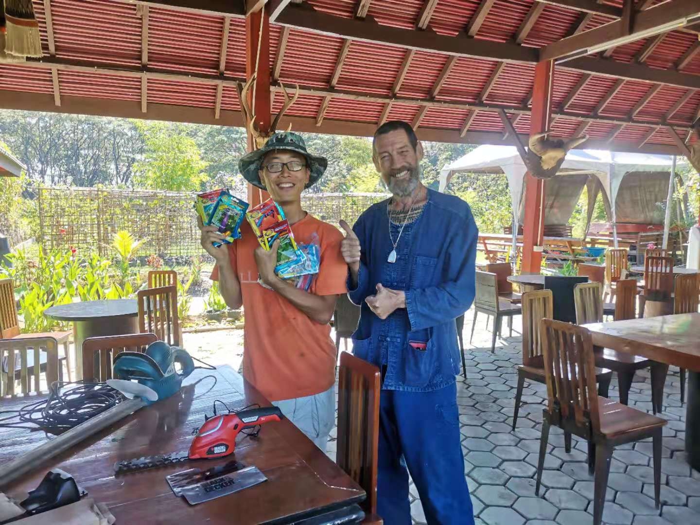 Our French friend Philips needs to take care of the plants in his own garden, so he has very little time to help us with the work in the second branch lately. He brought over his animal-shaped hedge trimmers and lawn mowers for us to use, and bought us more than 40 bags of vegetable seeds. Since we were here last year, Philips has always been helping us, donating washing machine, tools, seeds etc., and sometimes sharing his favorite food with us.Every time he comes to us,he tells us,if we need anything, just tell him,he would be very glad to help.We are so touched and grateful for such warm help and selfless dedication.Before he left, we gave him a bag of compost and four strawberry seedlings. Yangle told him that if his plants need more compost, just come here to pick up, and we will keep making compost all the time.