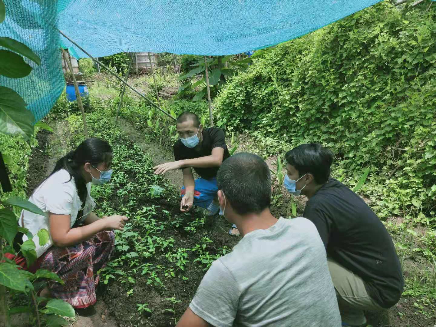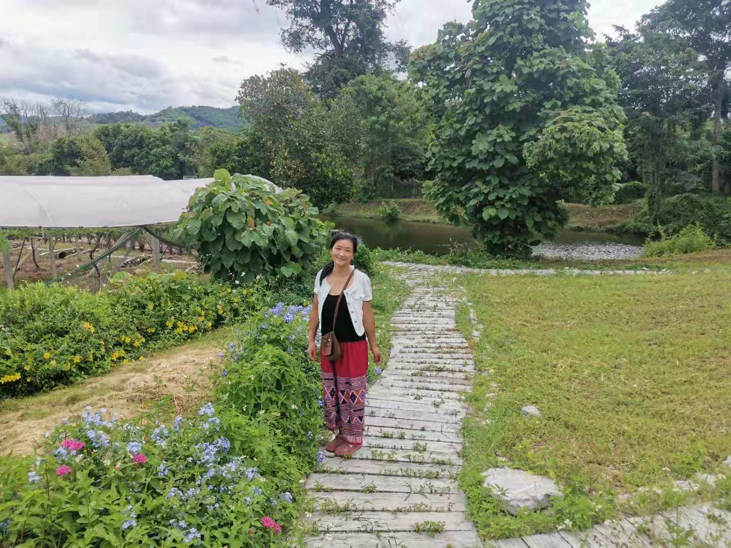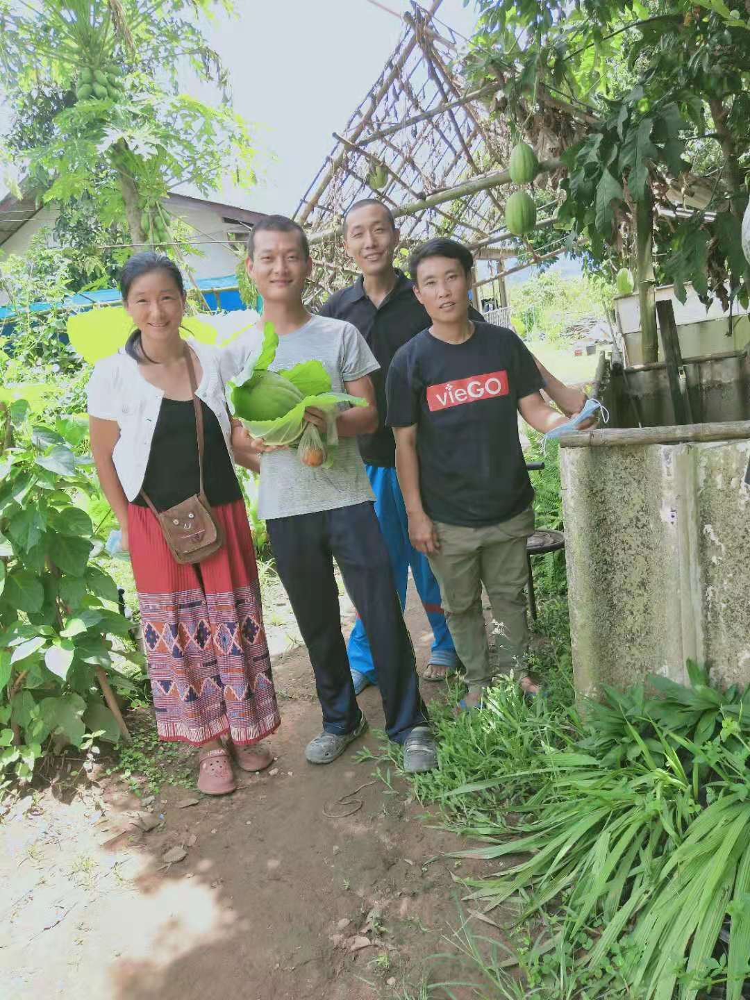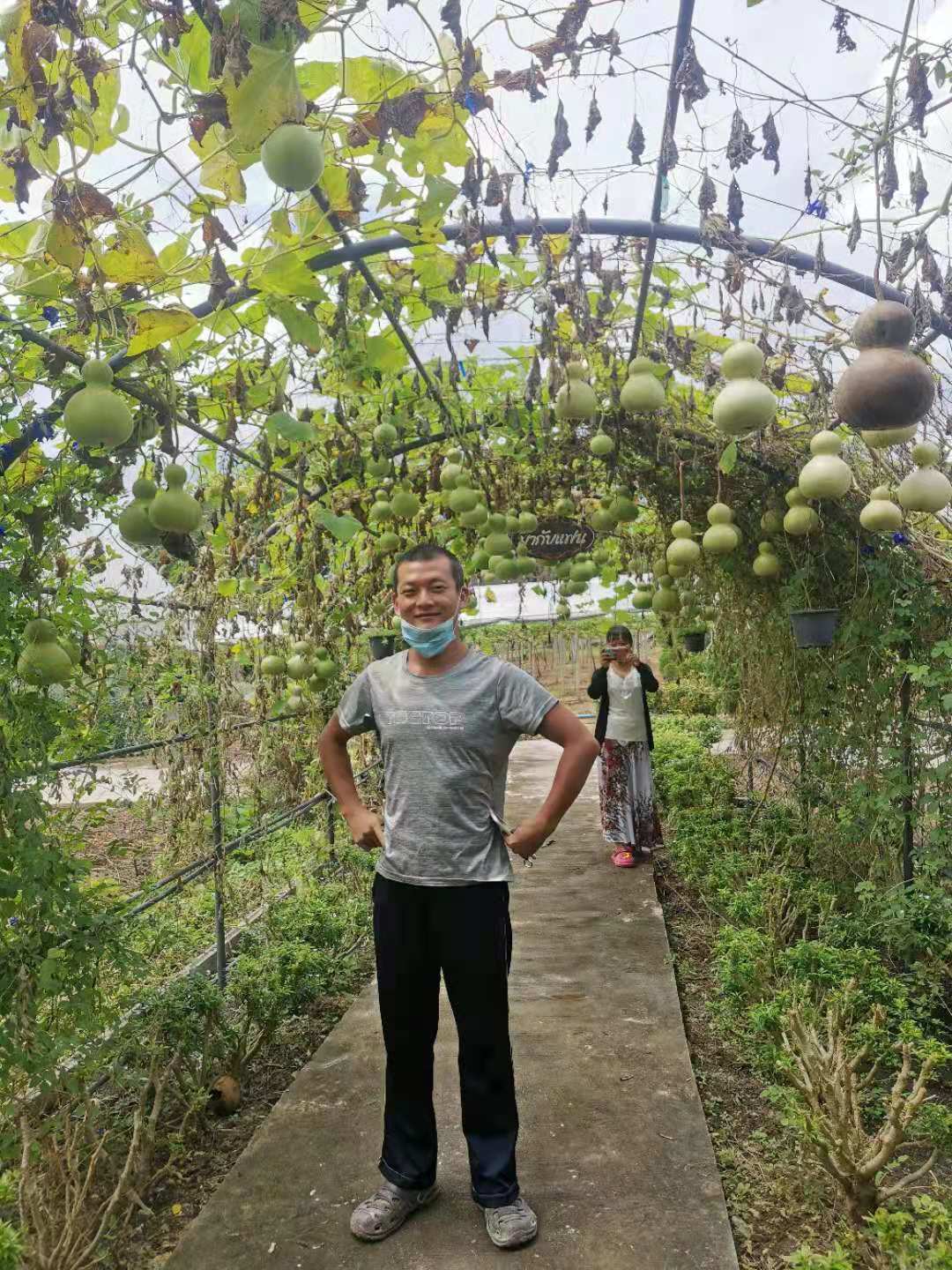 Then we went to visitour friend Gei. Every time we went to her organic farm, we could learn some vegetable growing experience from her. During this visit, due to the epidemic, she stopped the sale of vegetables and planted a lot of medicinal seedlings in the vegetable-growing area in the yard, saying it has the effect of preventing epidemics. Then she took us to visit her orchard. A little bit of Thai language and gestures with body language did not hinder communication between us. Before leaving, she picked us a winter melon with a special shape , picked a few eggfruit, and also gave us a pot of orchids.Thank you dear friend for your warm and lovely gifts,next time when we meet again ,what should we share!