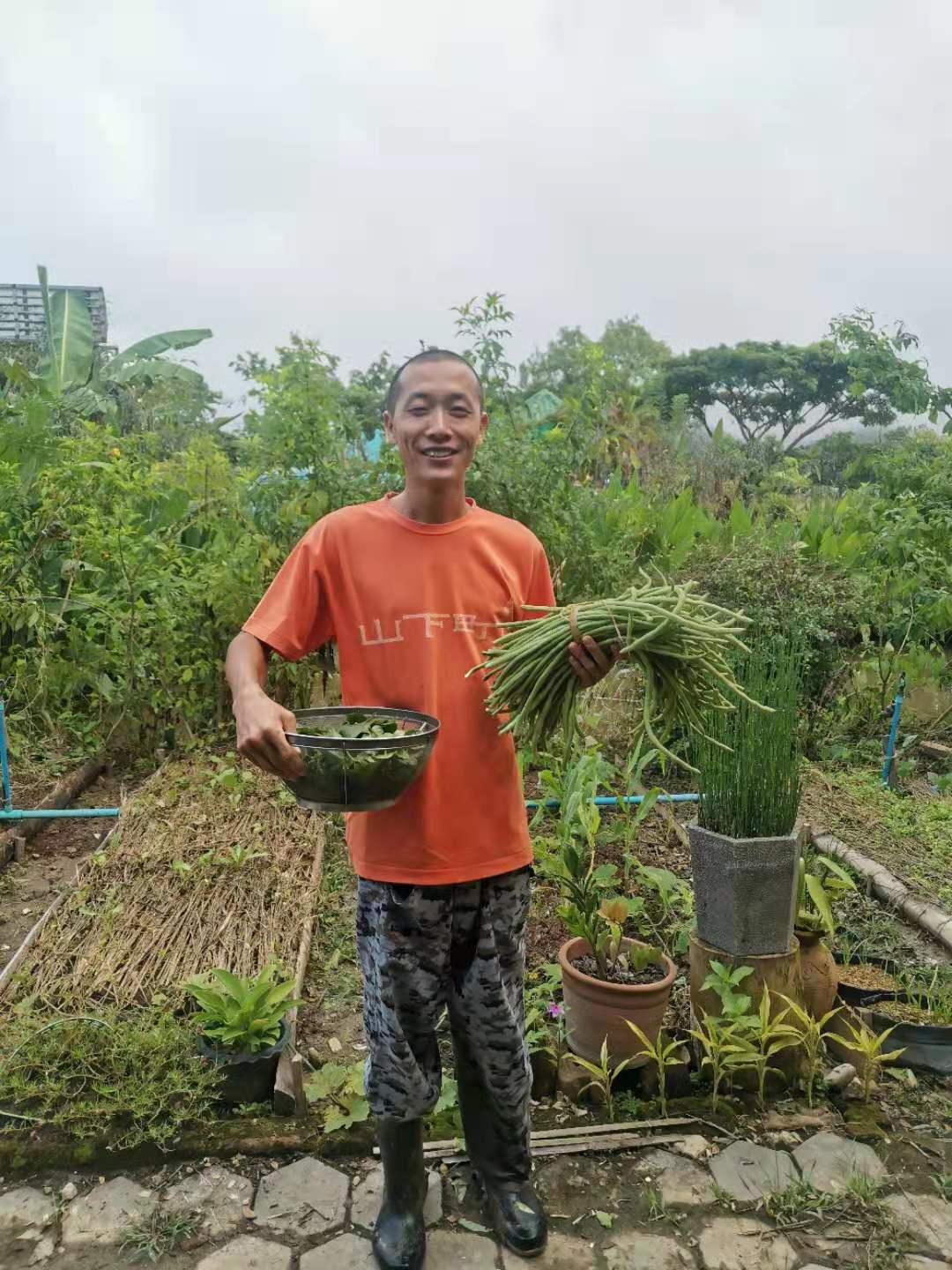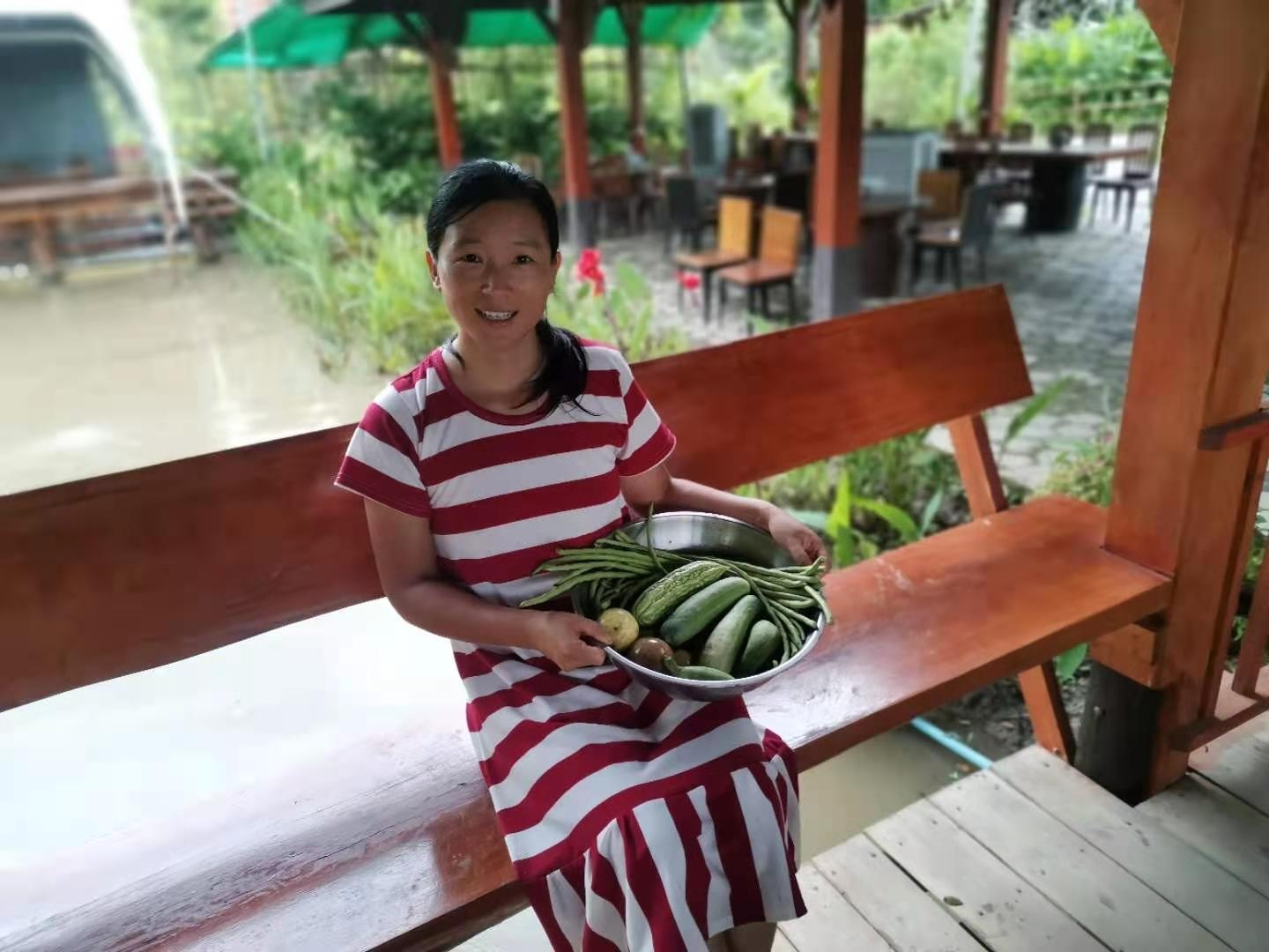 We have 20 small vegetable plots in front of the kitchen. After the soil was improved,garlic, cabbage, dwarf beans, leeks, fennel, celery, spinach were planted, and on a piece of ground strawberries that were seeded last year are spreading. At the back of the kitchen, each vegetable plot is about 1.5 meters wide and 10 meters long. There are 20 pieces in total,in which egg eggplants, water spinach, tomatoes, beans, cucumbers, loofah, Thai Melon, watermelon, pepper, corn, etc were planted. These days beans, cucumbers, greens, water spinach, fennel, etc. can be picked now.Especially the beans and cucumbers can be harvested in large quantities every other day.