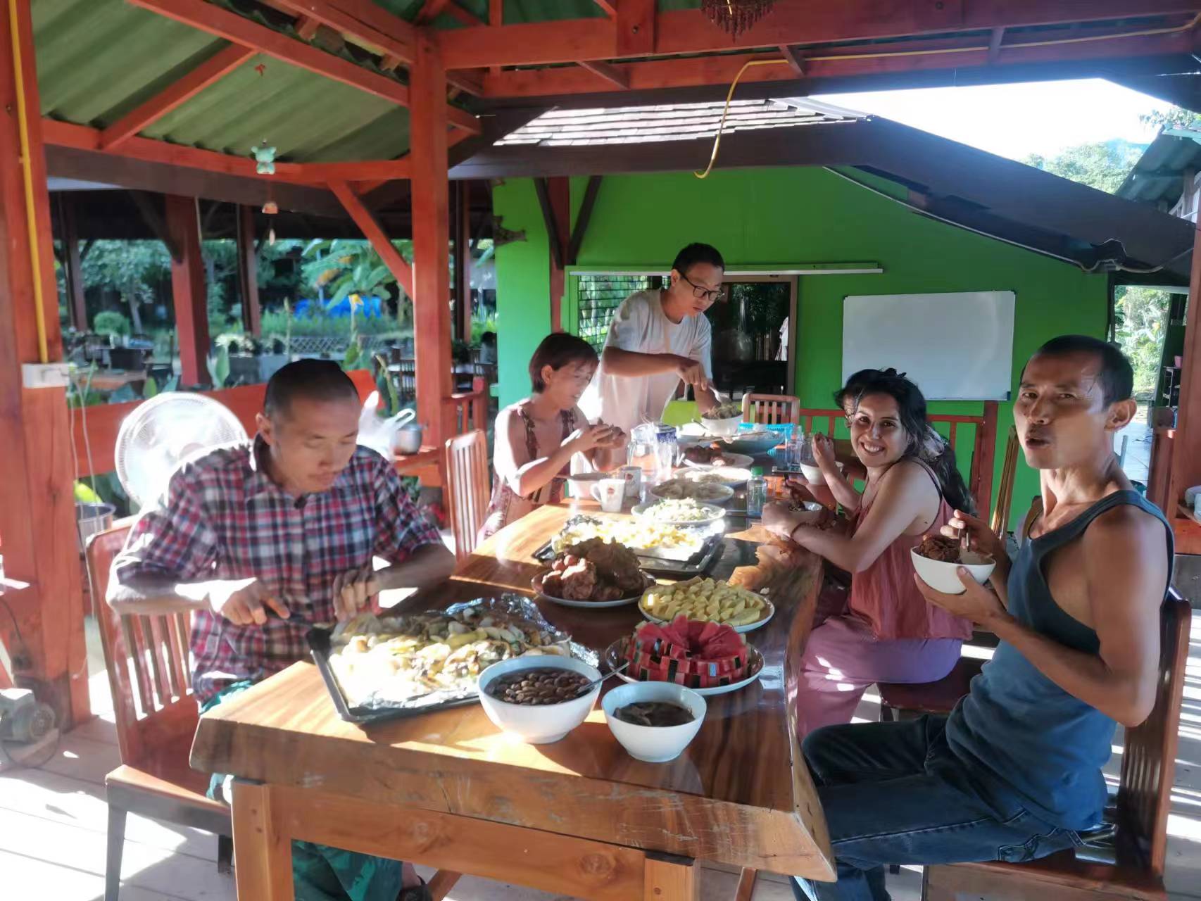 While the British boy had to extend his visa in the neighboring country, Maria joined us in planting passion fruit, weeding, and nurturing seedlings in Thai Home. The night before her departure, we organized a small and impromptu song and dance party. Yu Lin cooked a delicious big meal, and Yang Le helped make pizzas. After dinner, each of us sang beautiful songs, and in the end, we all danced together. The warm and charming night made it hard to say goodbye. Maria had been living in Thai Home for two weeks and wrote a long and touching review and reflections on her experience in Thai Home on the HelpX website, expressing her appreciation and deep emotions for the experience. Before her departure, we all hugged and wished her well. Please enjoy the photos.