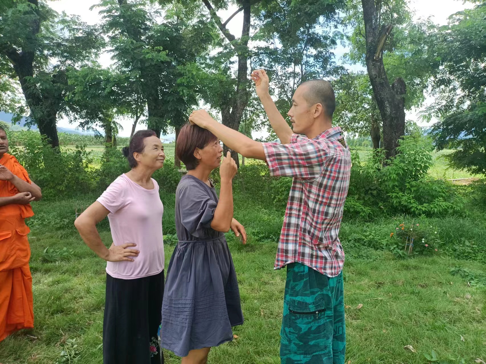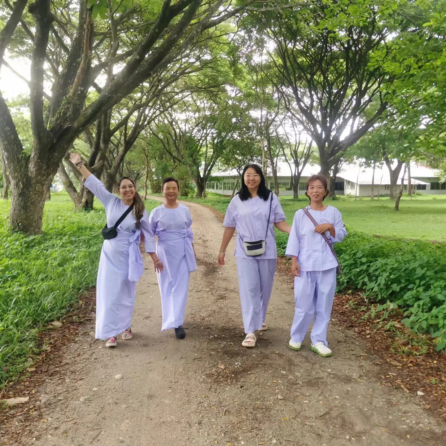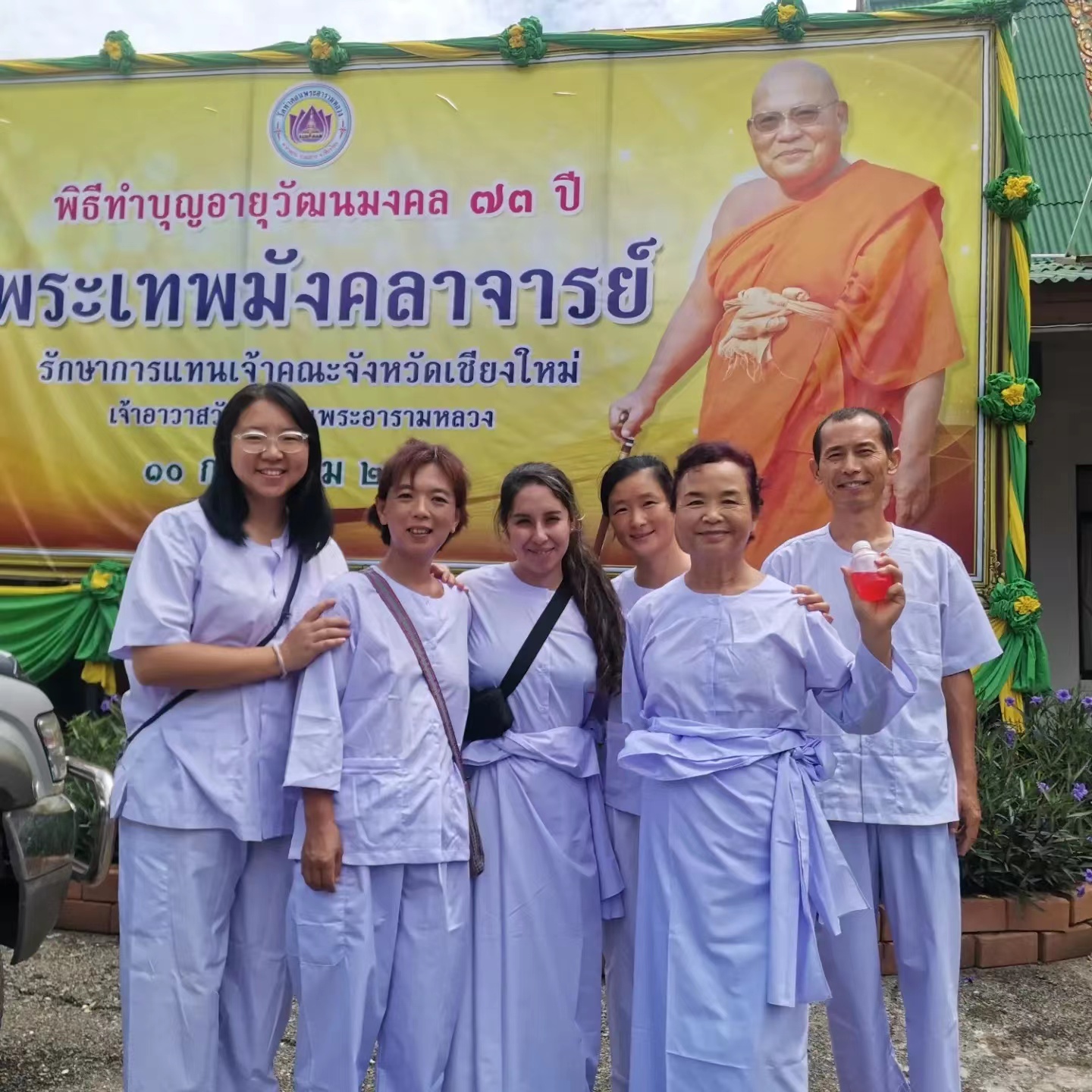 On the 10th of July, everyone dresses in white to celebrate the Abbot‘s birthday. The temple is filled with various food stalls offering snacks, desserts, ice cream,noodles, and more. Anyone attending the festival can freely enjoy these treats. We spent the morning at the temple, eating, playing, and occasionally helping out. In the afternoon, we sang the birthday song in English for Abbot, which brought tears of joy to his eyes.