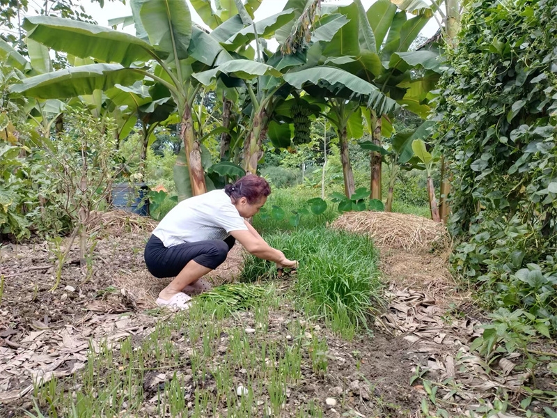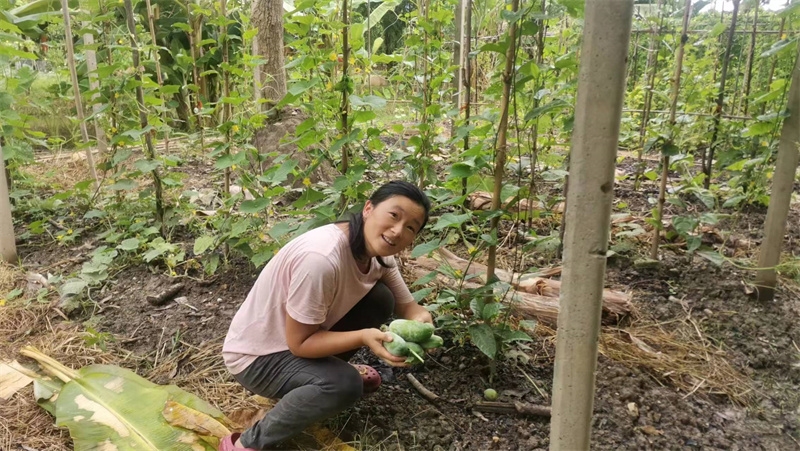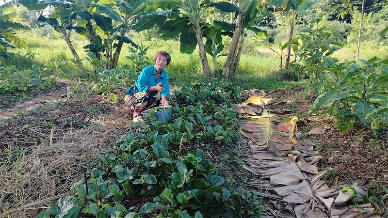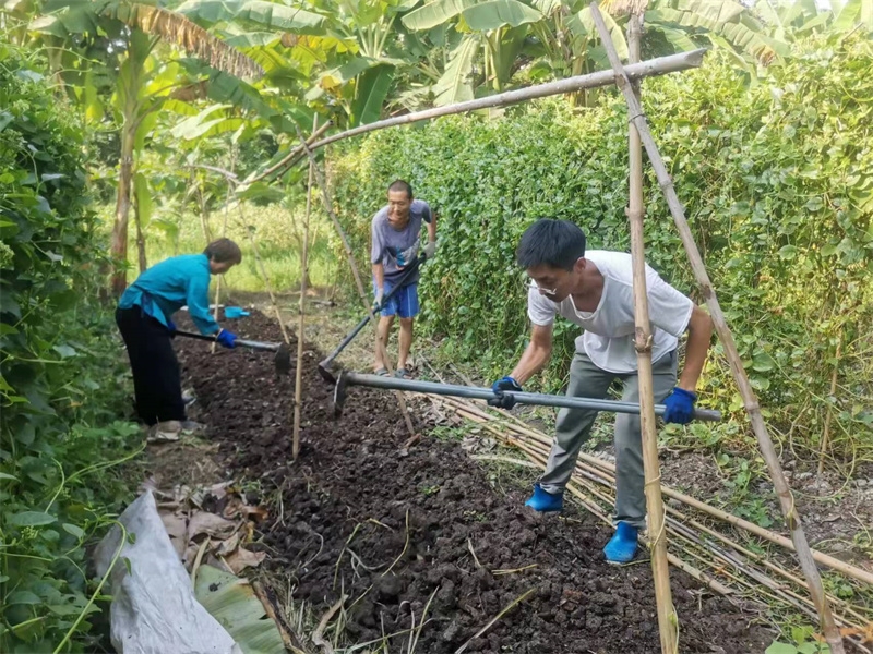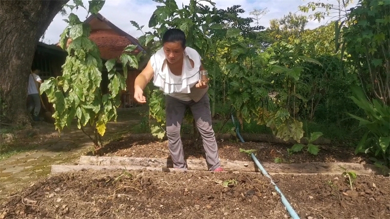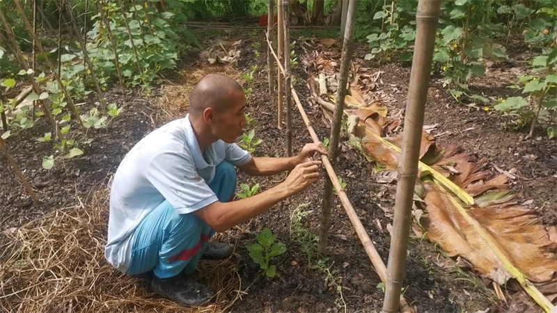 In recent days, Yang Le, accompanied by Qu Dan and Jiao E, collected a large amount of weeds and covered several eggplant and vegetable fields. They add fertilizer to some field beds, where long beans, Chinese kale, and corn were planted. To expand the vegetable planting area, the three of them tilled soil, mixed in fertilizer, and planted loofah and winter melon seeds on a higher ground by the large grassy area.