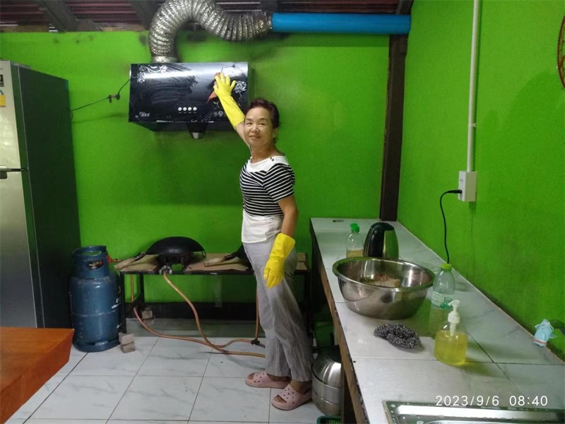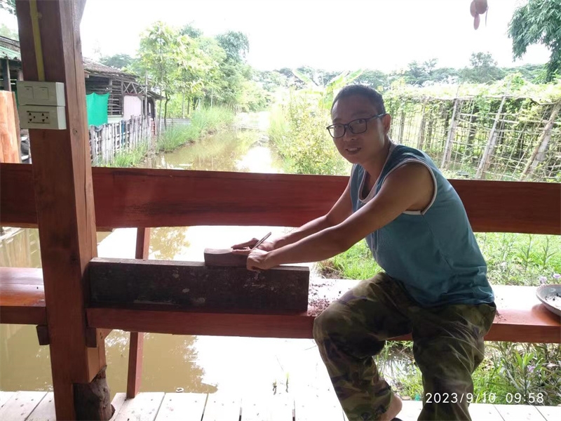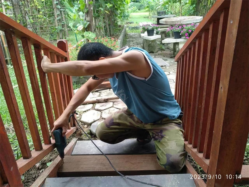Hui Guang found some old wood from a dismantled house in the garden and transformed it into brand new wooden boards. He renovated and reinforced the railing and stairs in front of the kitchen pavilion.