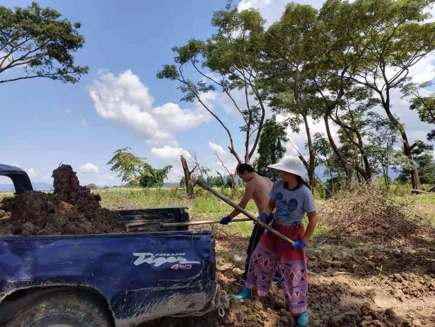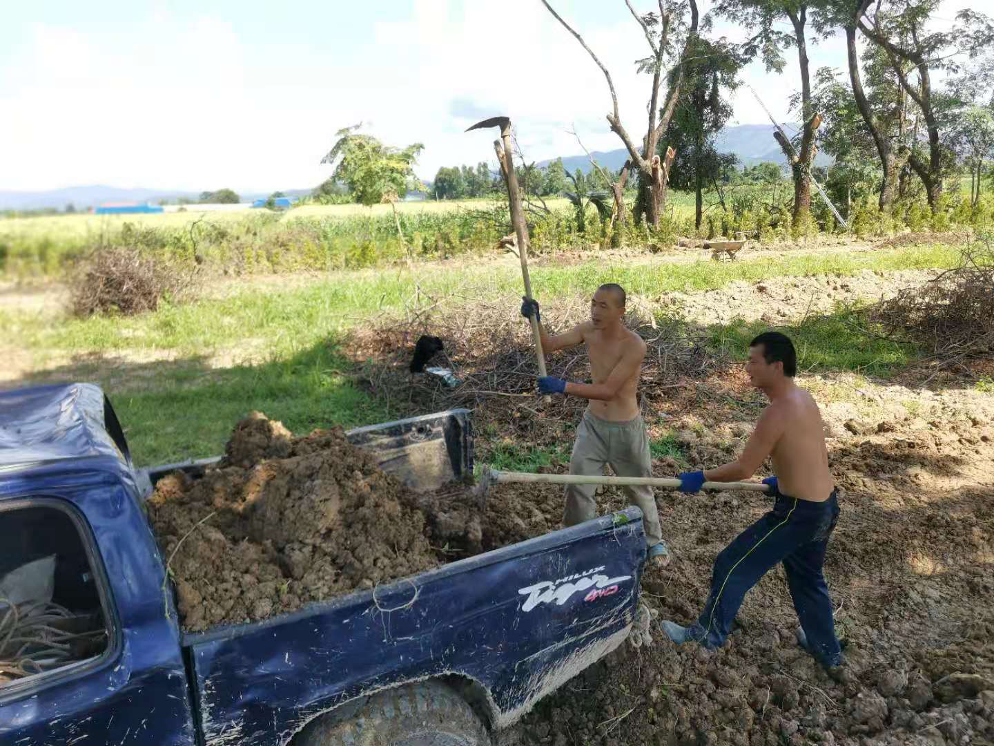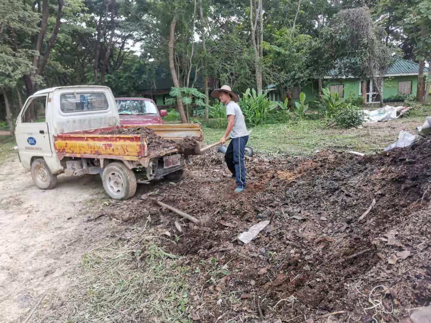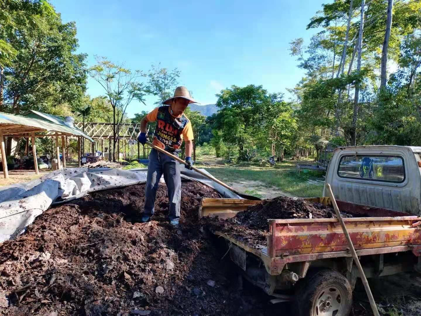 Recently, under the construction of the workers, the nursery room was completed.The Abbot let bring back several trucks of old wooden boards, tiles and furniture from temples in Chiang Mai and Bangkok. We helped unload the trucks with the workers for a few days. Yang Le and Hui Yi helped to pull soil and pave the path, transport fertilizer and transplant trees with the workers. In addition, they also helped to load sawdust and straw, and did mulch for the garden.Have been doing the heavy physical work for several days in a row, may brothers not be too tired.