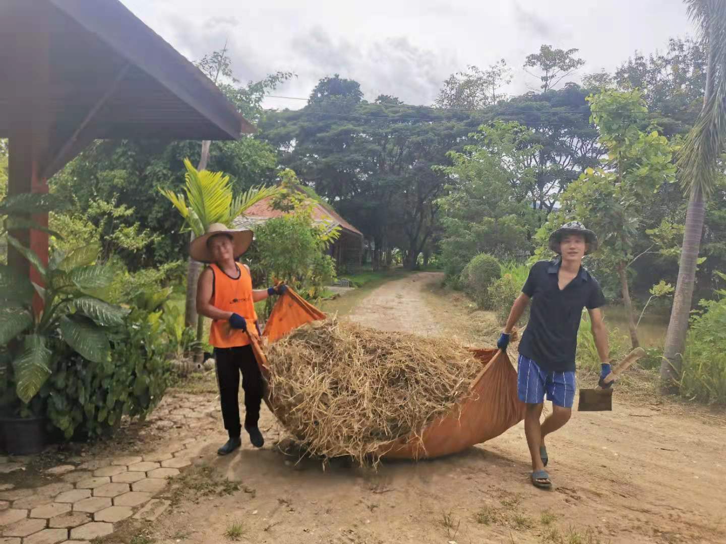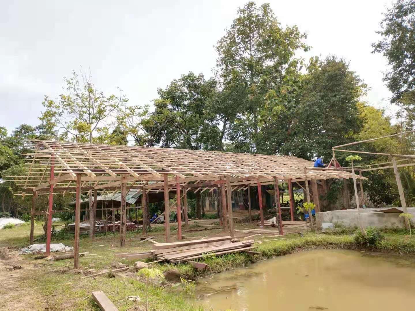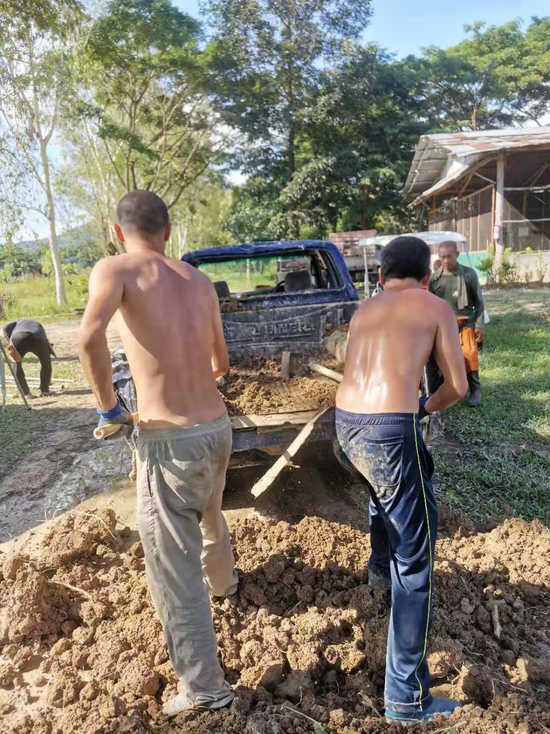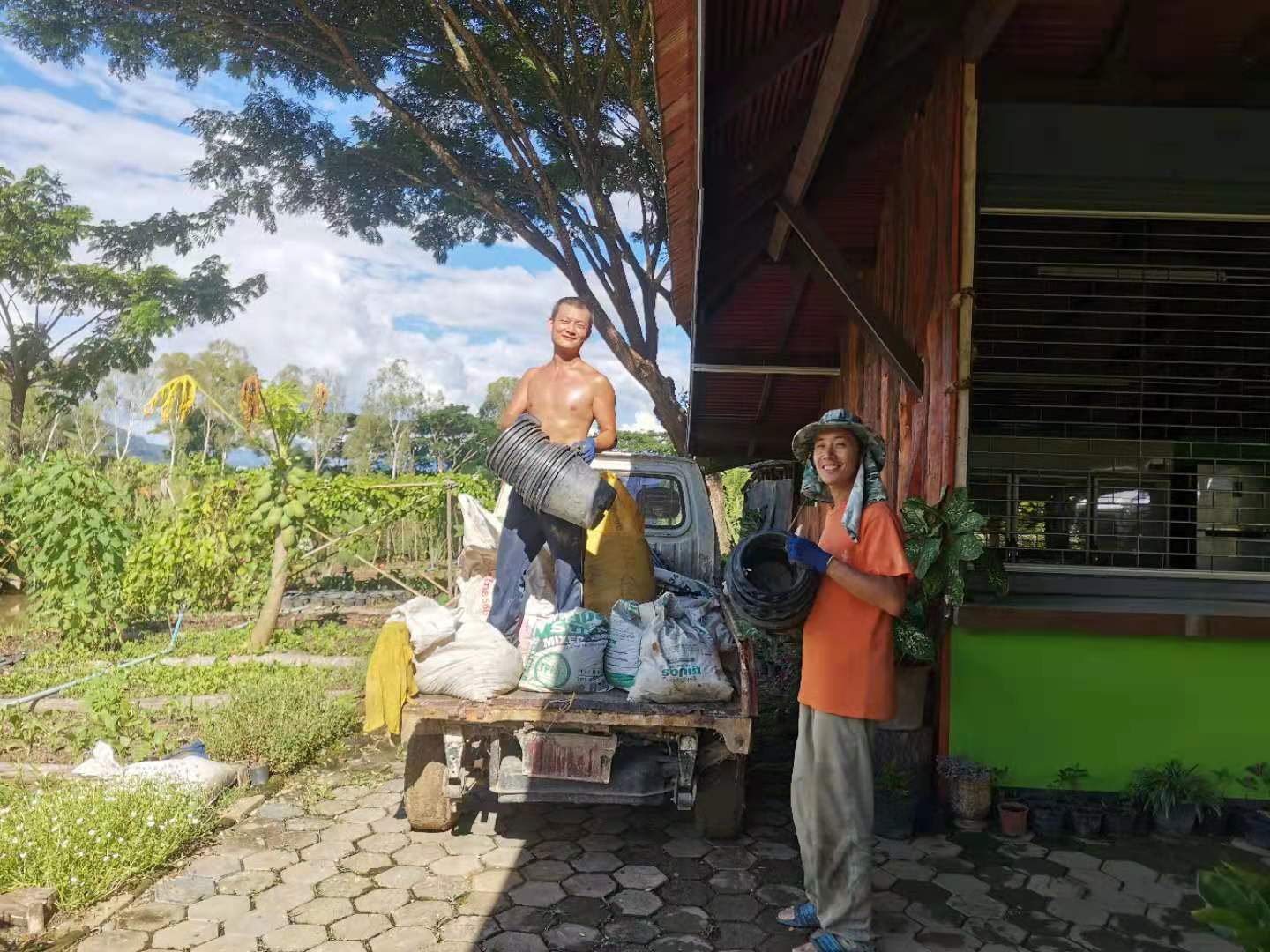 Recently, under the construction of the workers, the nursery room was completed.The Abbot let bring back several trucks of old wooden boards, tiles and furniture from temples in Chiang Mai and Bangkok. We helped unload the trucks with the workers for a few days. Yang Le and Hui Yi helped to pull soil and pave the path, transport fertilizer and transplant trees with the workers. In addition, they also helped to load sawdust and straw, and did mulch for the garden.Have been doing the heavy physical work for several days in a row, may brothers not be too tired.