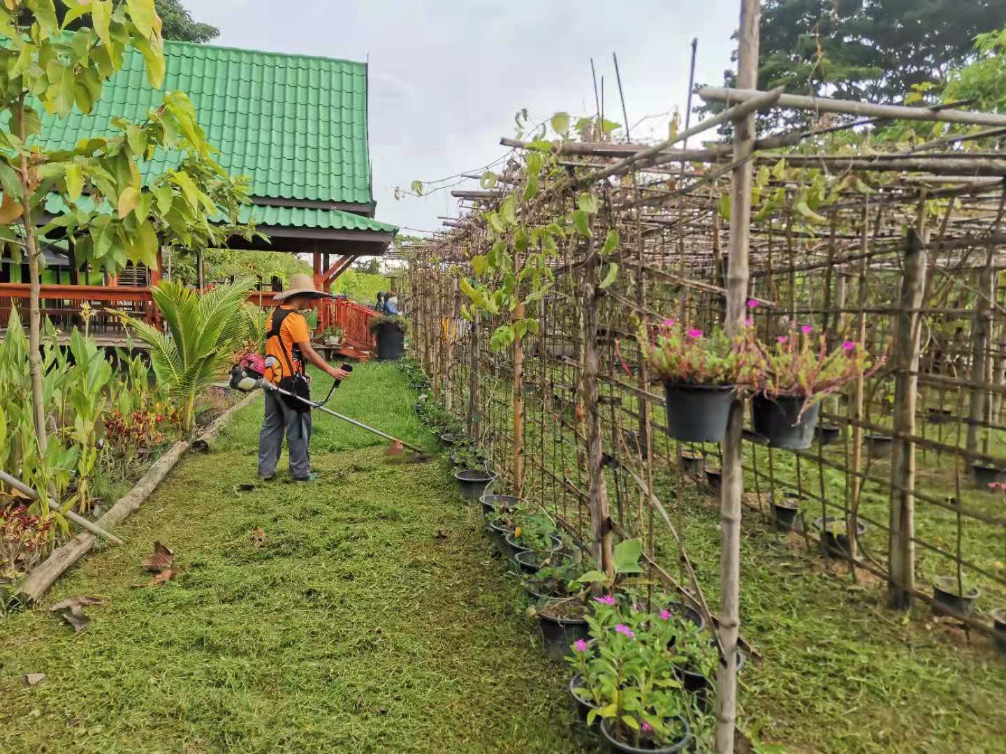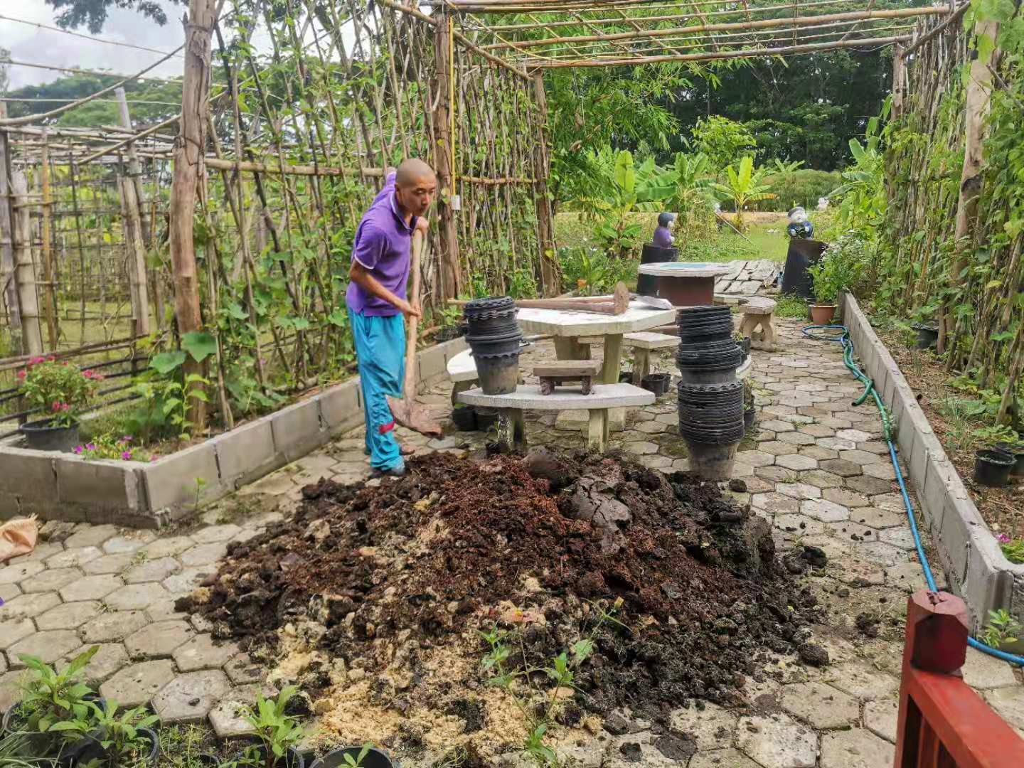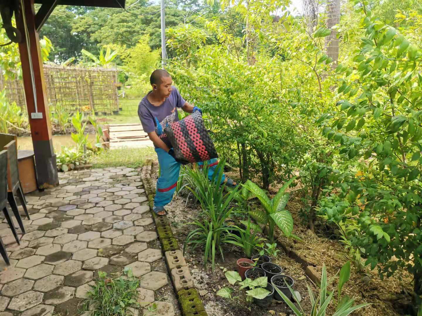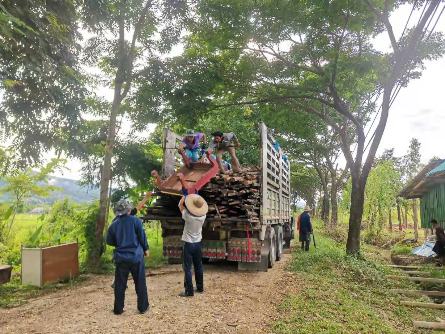 Recently, under the construction of the workers, the nursery room was completed.The Abbot let bring back several trucks of old wooden boards, tiles and furniture from temples in Chiang Mai and Bangkok. We helped unload the trucks with the workers for a few days. Yang Le and Hui Yi helped to pull soil and pave the path, transport fertilizer and transplant trees with the workers. In addition, they also helped to load sawdust and straw, and did mulch for the garden.Have been doing the heavy physical work for several days in a row, may brothers not be too tired.