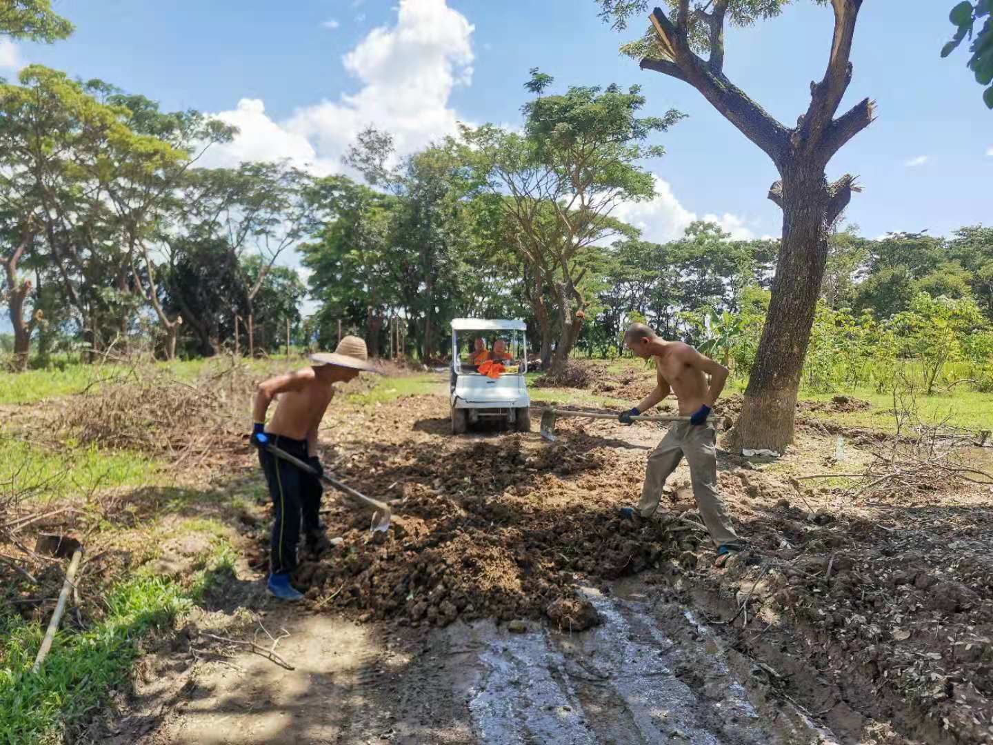 When carrying soil to pave path, I found that the bronzed skin of two brothers that had been tanned were really good-looking, healthy, fit and sexy. With the hoe , the soil was paved into a solid road under their feet, and the shoulders became more and more powerful and responsible, when sitting on the ground to rest, the body and the earth become one color, simple and natural, so beautiful that I want to close them,to smell whether the sweat on their bodies is the same as the soil of fragrance.