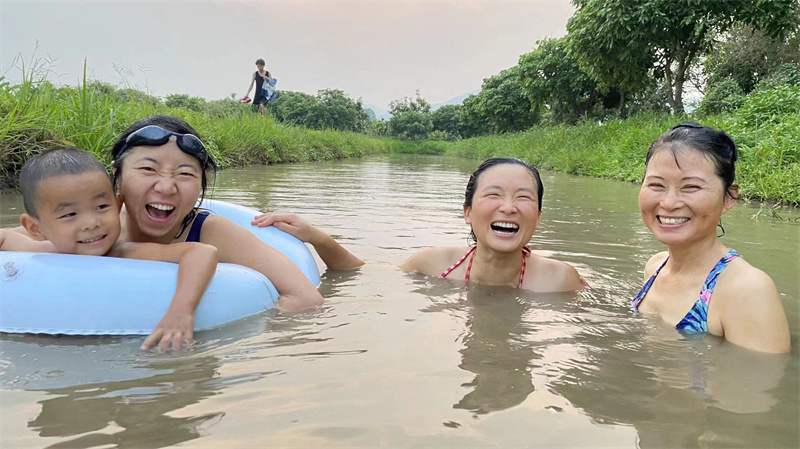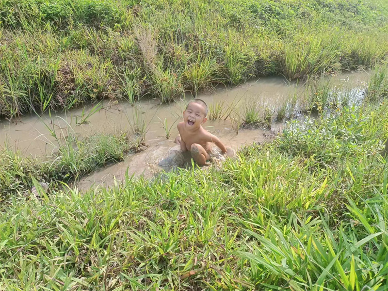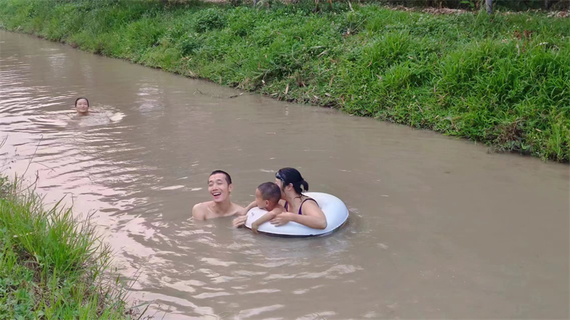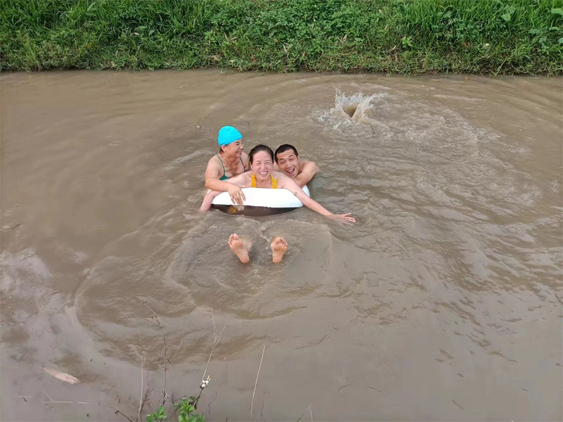 The mangoes in the mango orchard are ripe, sour, sweet, and delicious, and the red mulberries are hanging from the branches. The flowers nurtured by Jie Jing are also blooming gorgeously. Little kid Deng Deng is playing freely and happily in the small stream. Yesterday evening, sisters put on sexy swimsuits and went swimming in the pond in the mango orchard. At first, we were hesitant due to the murky water, but once we got into the water, looking up at the blue sky and feeling the warmth and gentleness surrounding us, we still had a delightful and joyful time!