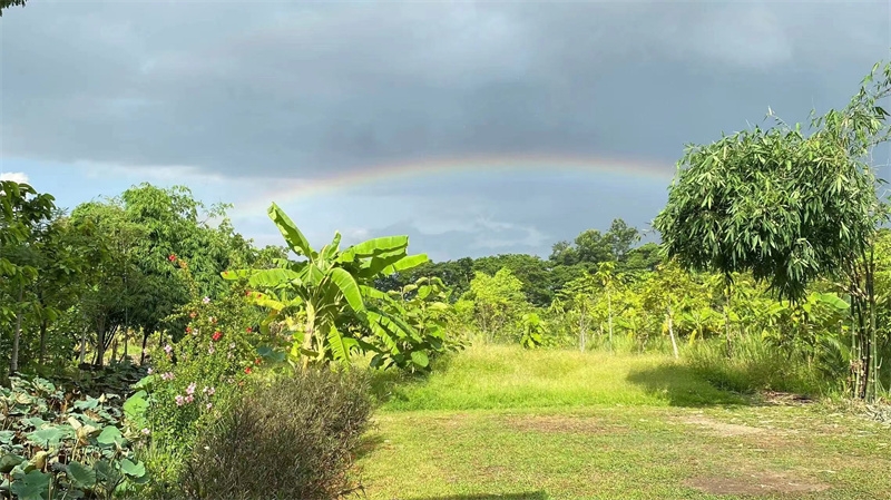 The rainy season washes the sky to a clear blue, with playful white clouds changing shapes charmingly. A passionate sun shower brought a shy visit from a rainbow girl, who became even more radiant and beautiful under the admiration and cheers of the celestial beings in the garden, blooming with colorful affection!
