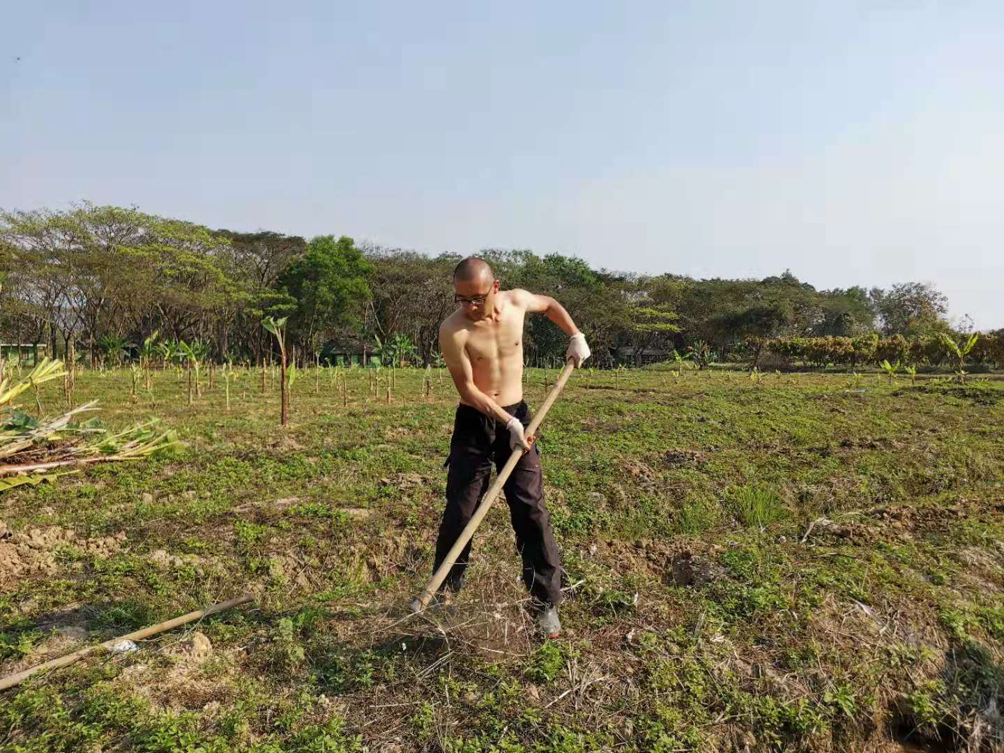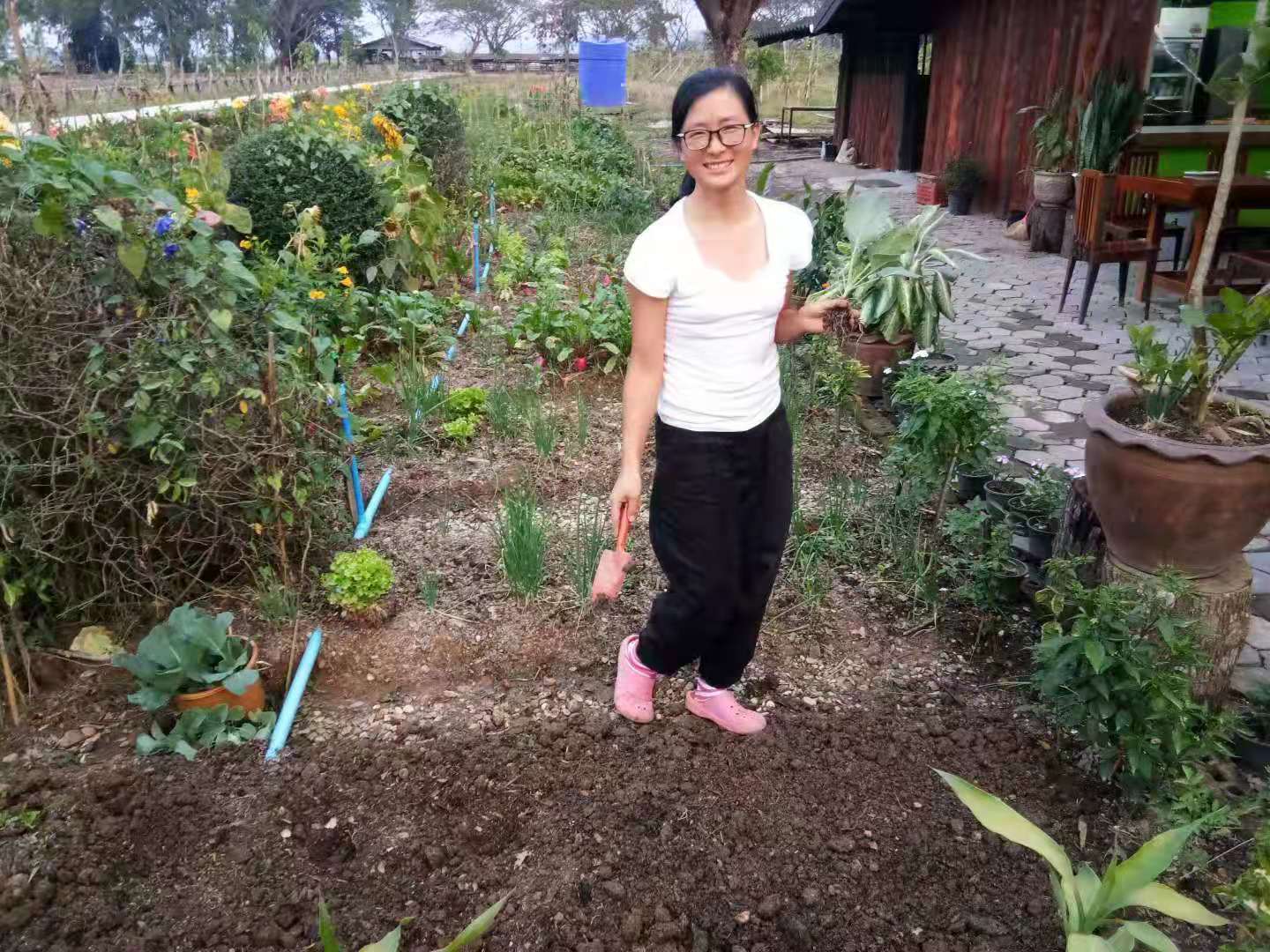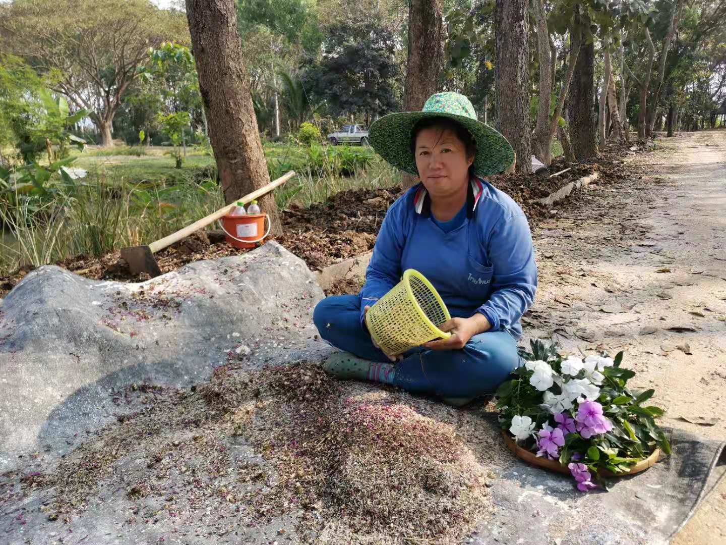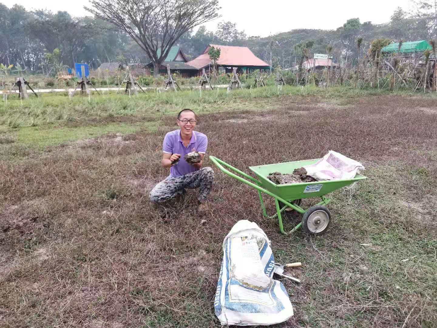 Recently, our main work is still planting flowers and trees to beautify the environment of the ecological garden. Because Huiguang brother went back to the the first branch to repair the water pump and build garage. Yang Le brother, the Chinese-speaking brother, and a young monk are digging holes to plant landscape trees and banana trees. Qianzi works with a Thai sister Lulu. She is kind and lovely, hardworking and simple.While working, she teaches Qianzi Thai. She likes to joke ,working with her,we laugh a lot. Excepting collective work with everyone,Yangle and Qianzi also find work they are interested in. Yangle likes composting,growing melons and planting fruit trees. Qianzi likes to grow flowers. We plan to gradually turn this place into a paradise full of melons, fruits and flowers.