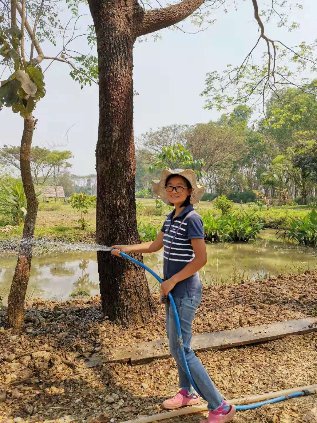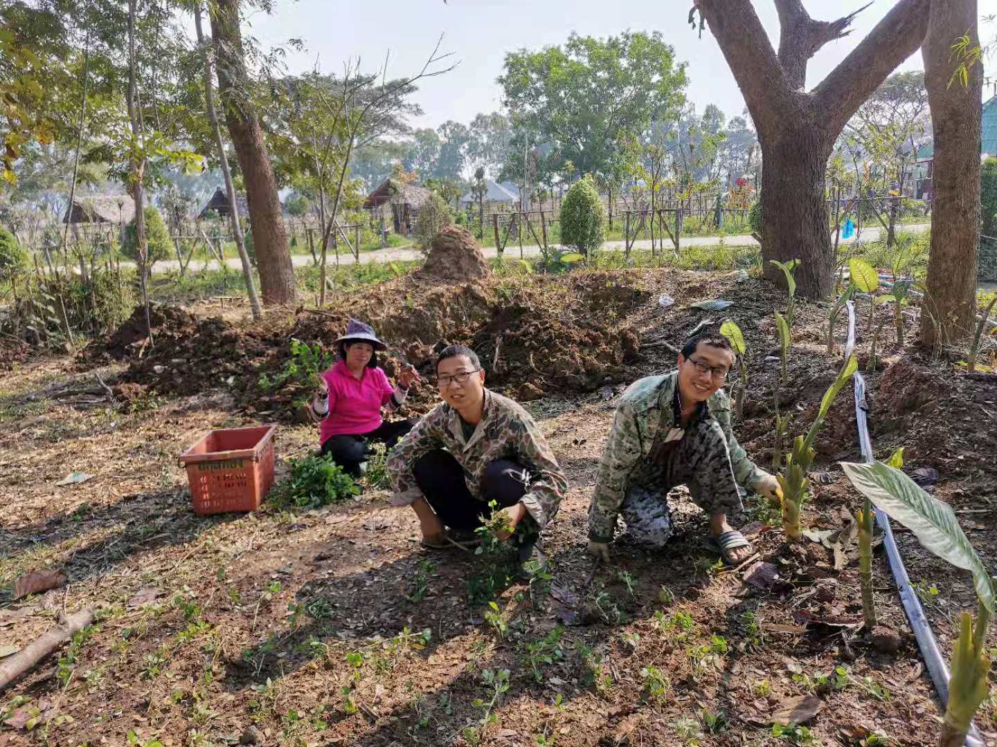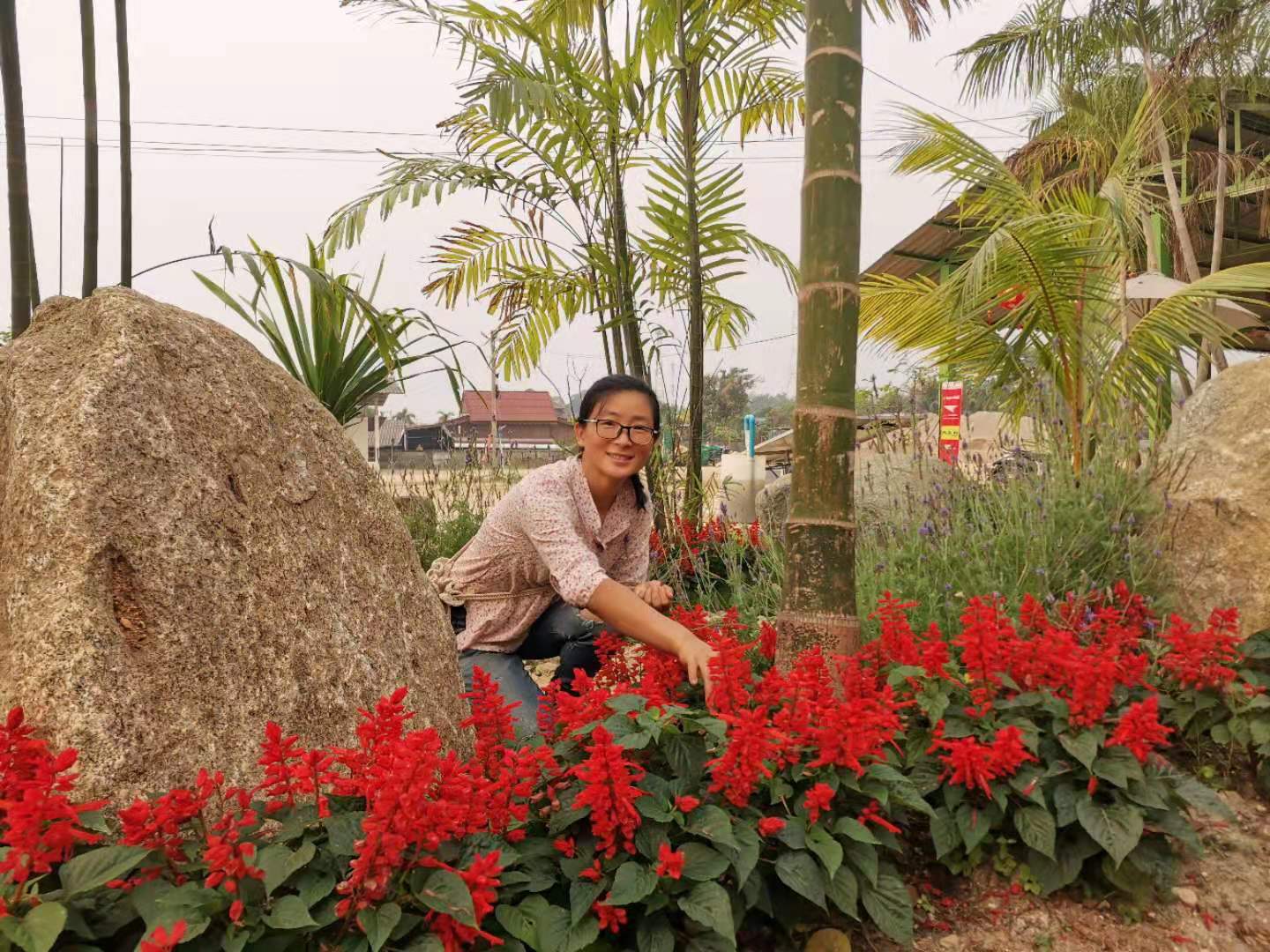 Recently, our main work is still planting flowers and trees to beautify the environment of the ecological garden. Because Huiguang brother went back to the the first branch to repair the water pump and build garage. Yang Le brother, the Chinese-speaking brother, and a young monk are digging holes to plant landscape trees and banana trees. Qianzi works with a Thai sister Lulu. She is kind and lovely, hardworking and simple.While working, she teaches Qianzi Thai. She likes to joke ,working with her,we laugh a lot. Excepting collective work with everyone,Yangle and Qianzi also find work they are interested in. Yangle likes composting,growing melons and planting fruit trees. Qianzi likes to grow flowers. We plan to gradually turn this place into a paradise full of melons, fruits and flowers.