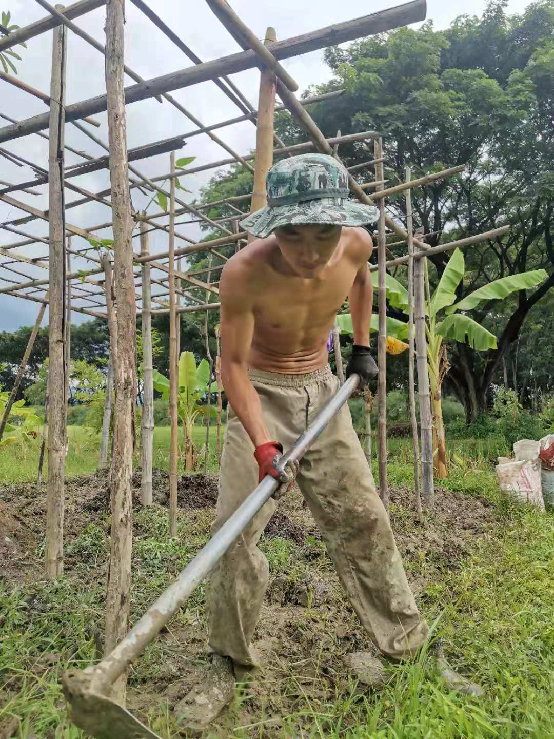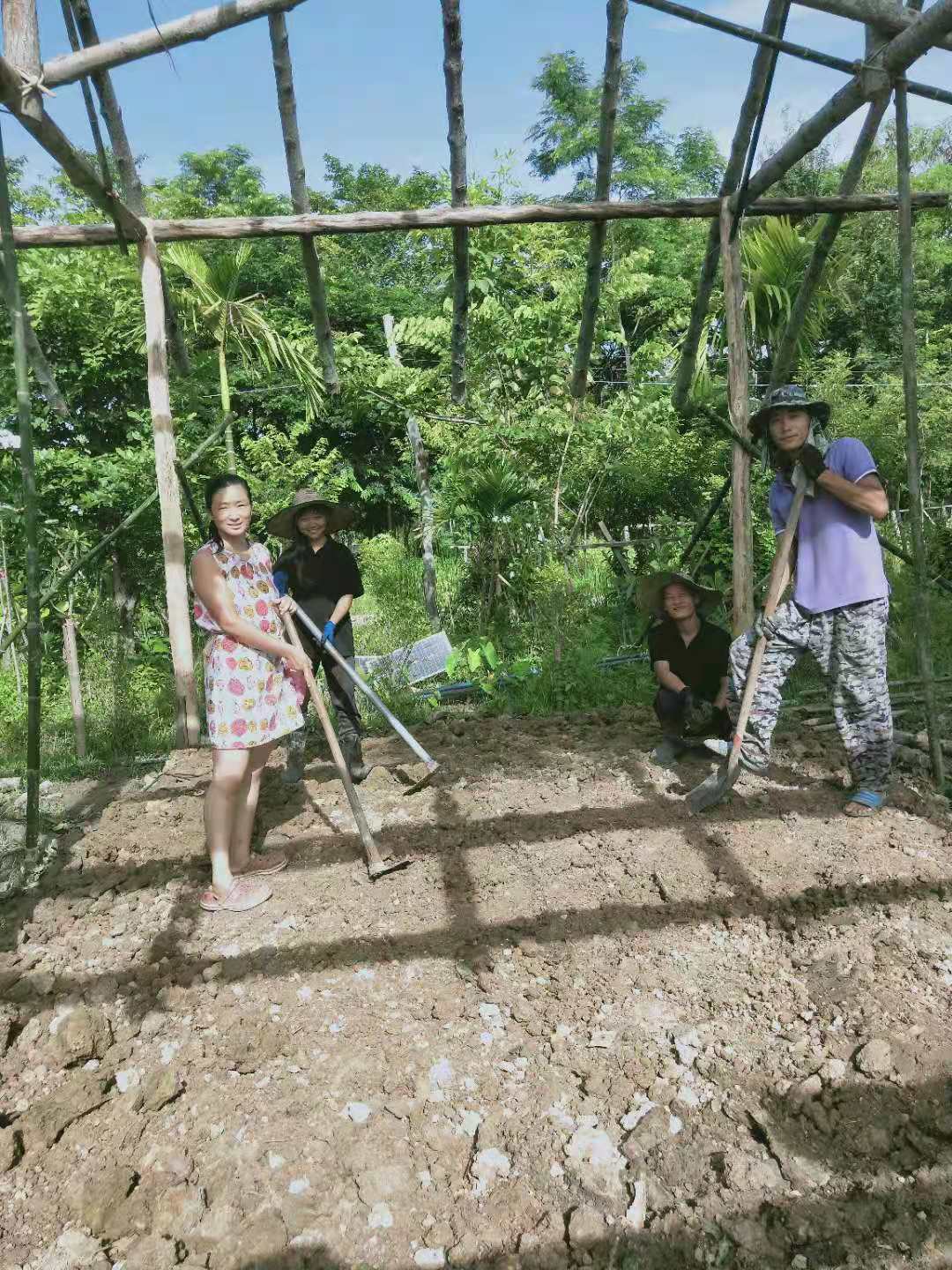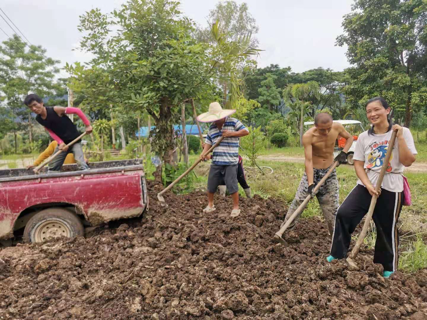 When we didn't help on the construction site , we went to pick up cow dung, collect grass,make compost, move vegetable seedlings to the fields. The soil here is clay, Yang Le and Qian Zi have discussed many times about how to improve clay, and we also learned an method from our friend Gei, an organic planting expert.Yang Le decided to use the method taught by Gei to shovel the clay and mix well with a large amount of organic matter(leaves and rice skins) on the small vegetable plot in front of the kitchen, and then cover the field with the straw, spray liquid fertilizer and em liquid into the soil. After seven days,we can plant vegetables on the soil and let the soil soften slowly. For the large vegetable plot behind the kitchen, Yang Le planed to dig out the clay at the place where we are going to plant seedlings and replace the original clay with the mixed soft soil.