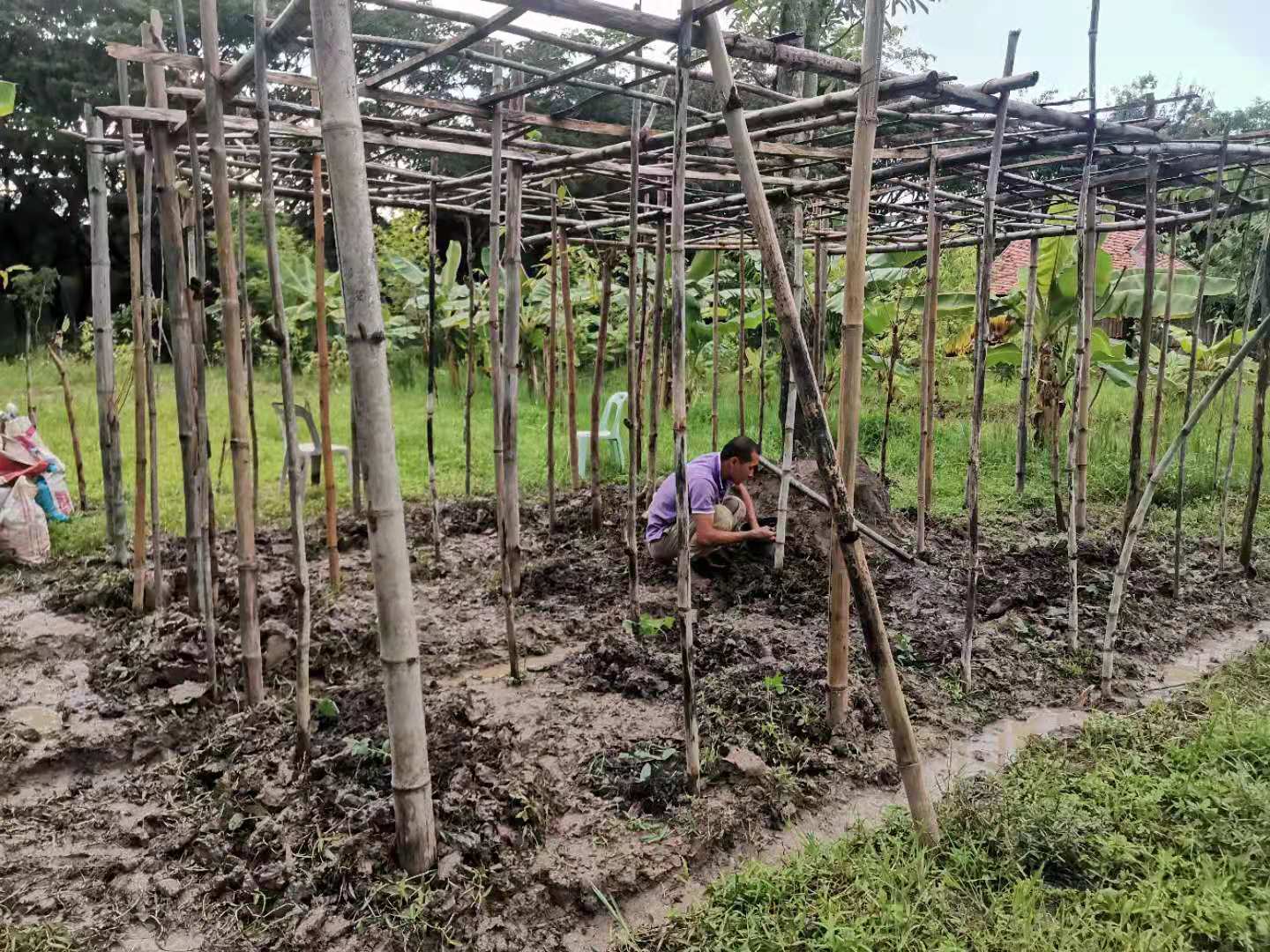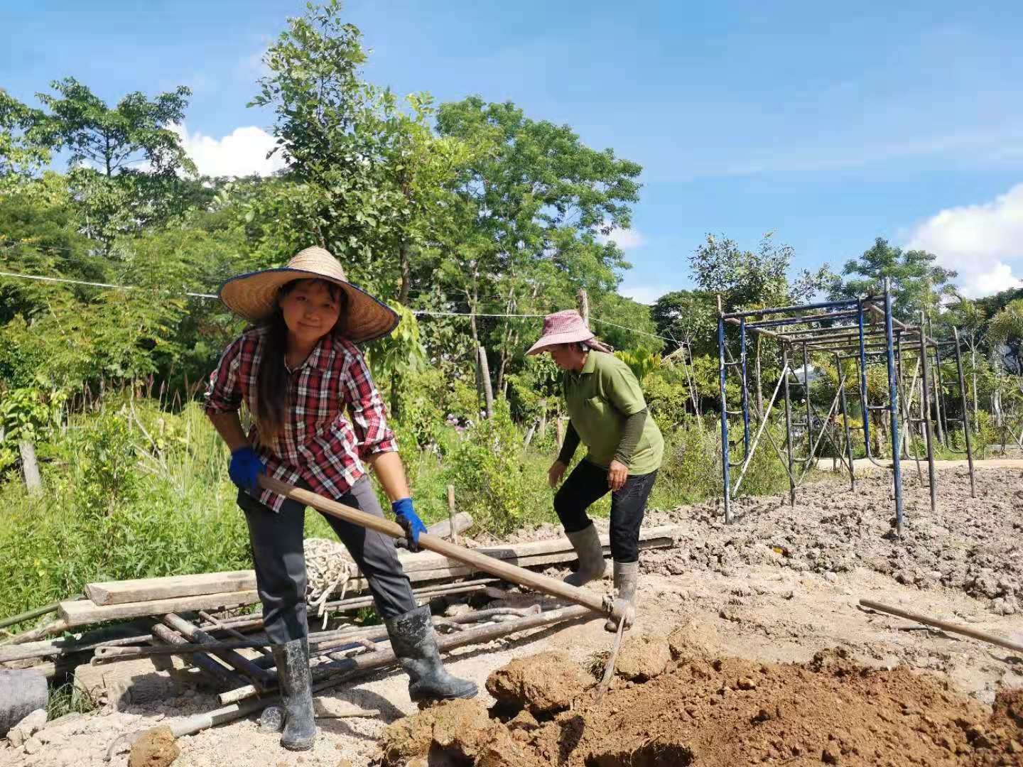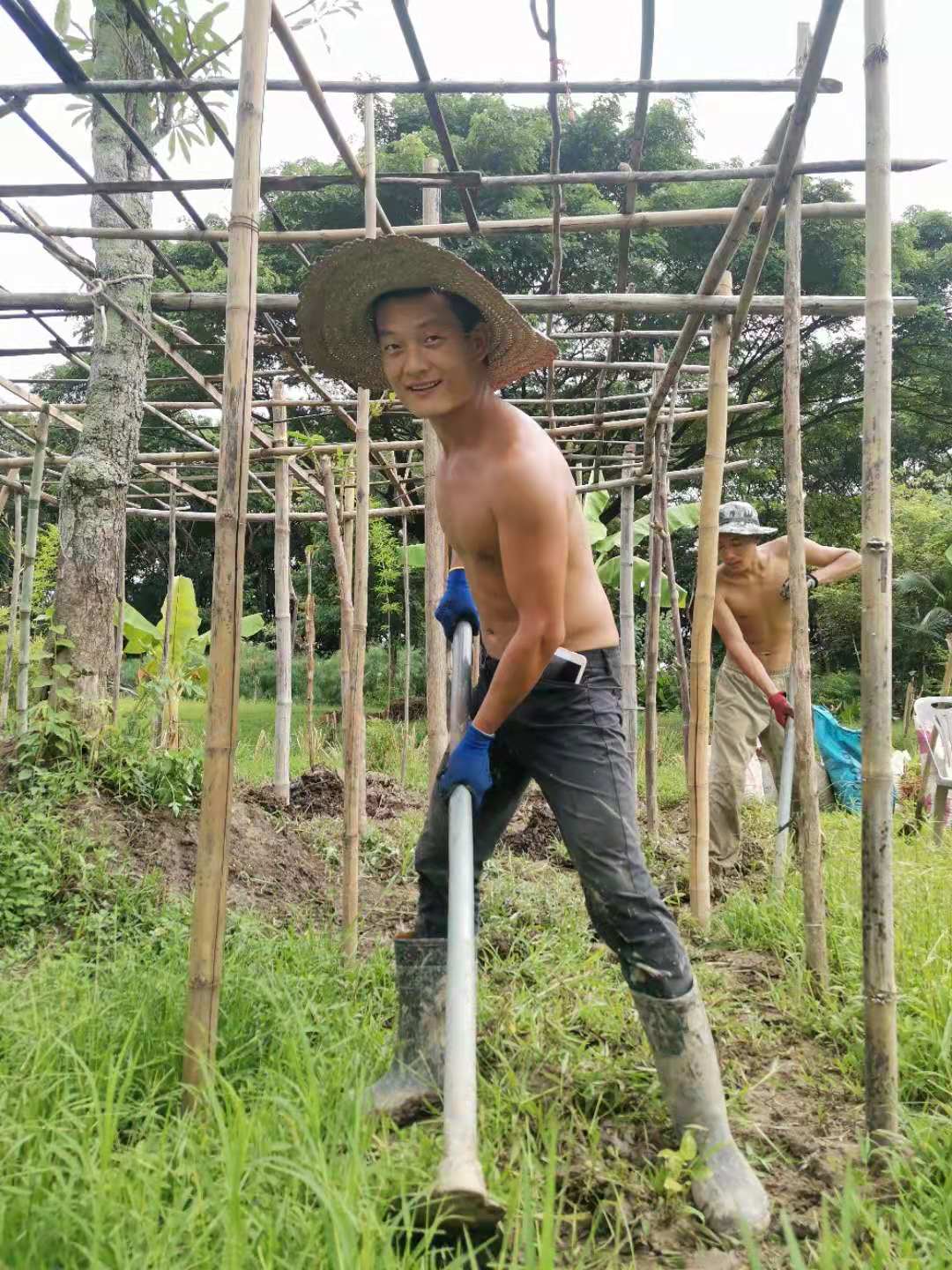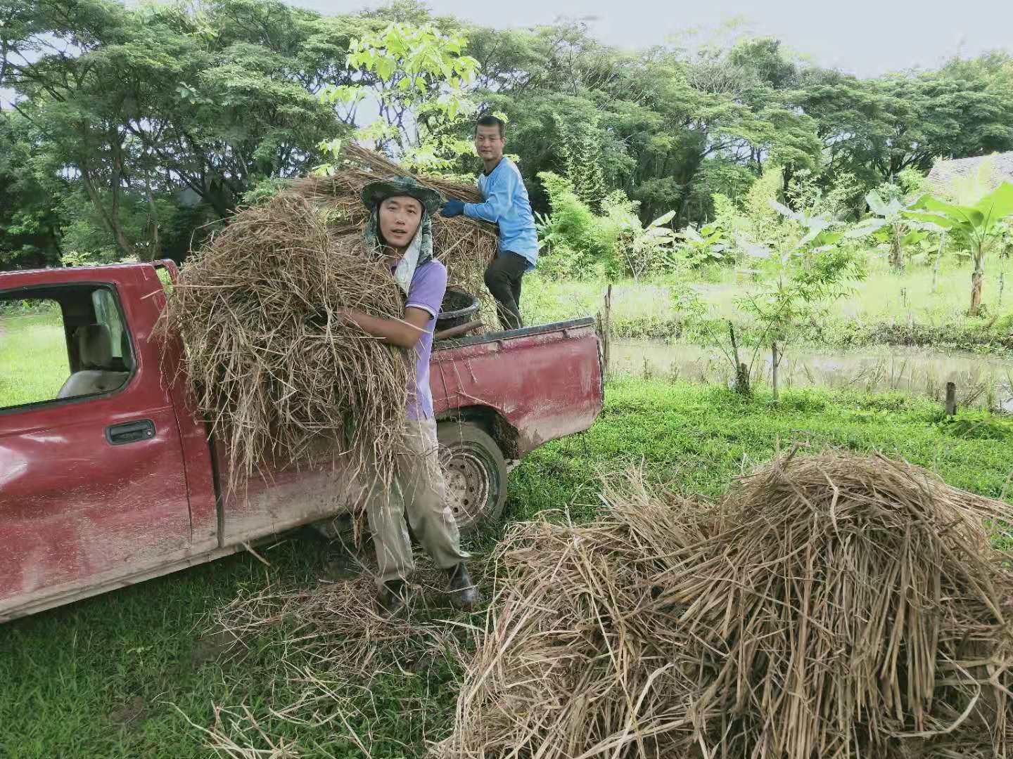 When we didn't help on the construction site , we went to pick up cow dung, collect grass,make compost, move vegetable seedlings to the fields. The soil here is clay, Yang Le and Qian Zi have discussed many times about how to improve clay, and we also learned an method from our friend Gei, an organic planting expert.Yang Le decided to use the method taught by Gei to shovel the clay and mix well with a large amount of organic matter(leaves and rice skins) on the small vegetable plot in front of the kitchen, and then cover the field with the straw, spray liquid fertilizer and em liquid into the soil. After seven days,we can plant vegetables on the soil and let the soil soften slowly. For the large vegetable plot behind the kitchen, Yang Le planed to dig out the clay at the place where we are going to plant seedlings and replace the original clay with the mixed soft soil.