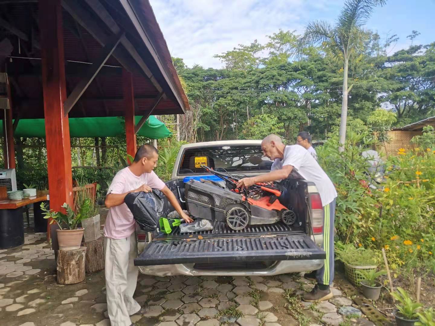 This morning Huiyi,Huanxin and Huiguang went to Chiang Mai to extend visa, and planned to stay in the first branch for a few days to mow the grass in the yard and the mountain. Philippe, a French friend who loves labor and is always willing to help others, rides his motorcycle and brings his tools along with Huiyi ,goes to the first branch to help mow the grass. I wish everything goes well in the first branch,and dears return soon!