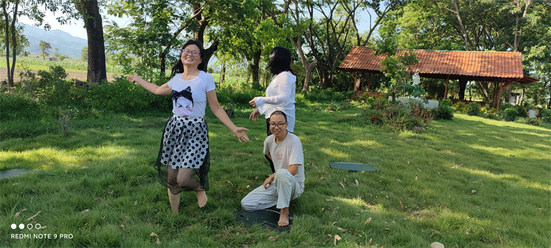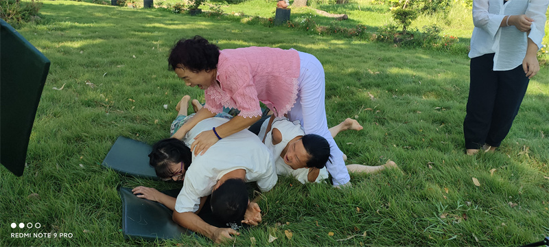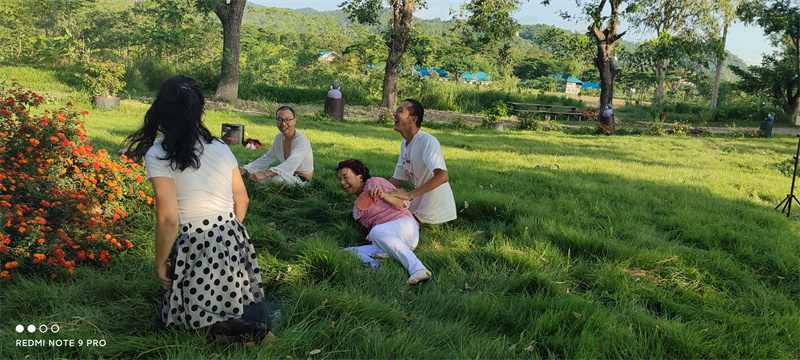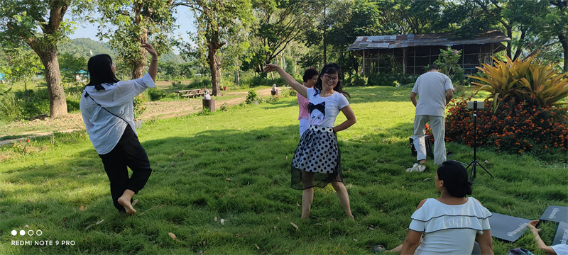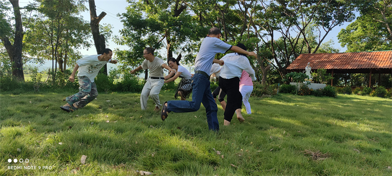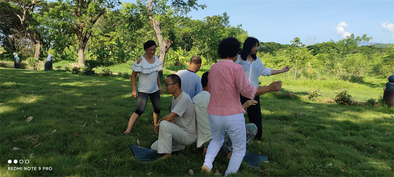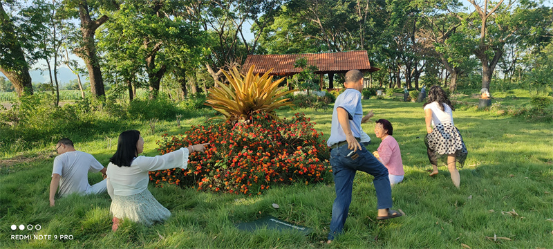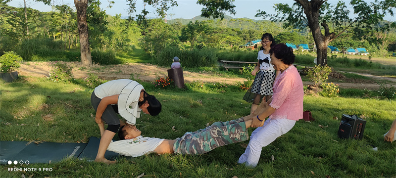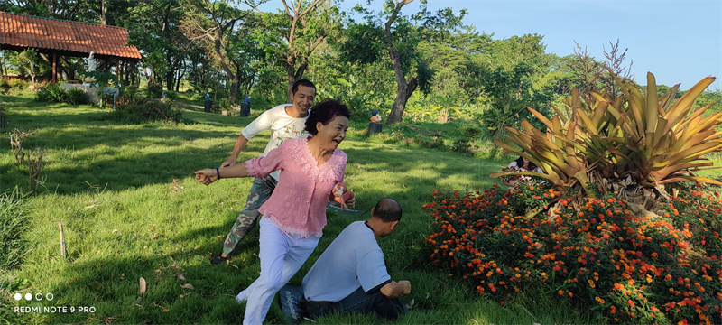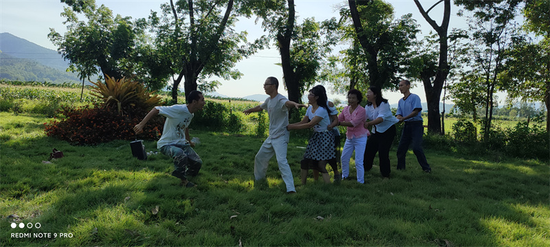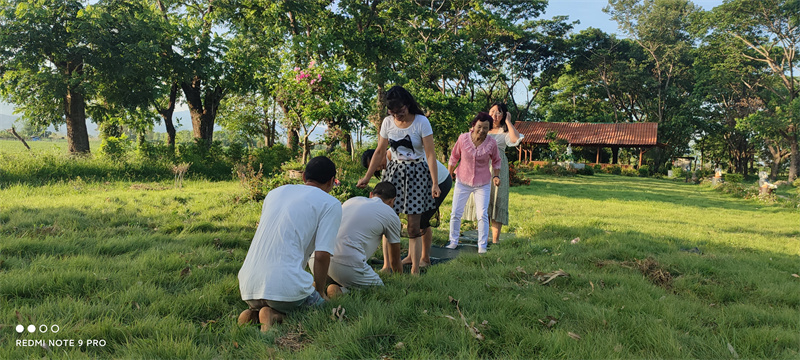早晨六点，八仙坐在一起诵读了“入住第二家园祈祷词”，向上帝爷爷祈祷感恩。接下来，迎着朝阳伴着盛开的花儿，激情昂扬跳了绿旋风开场舞，之后大家兴高采烈来到青翠柔软的“新西兰草原”，先后玩了"翻山越岭钻山洞"，"丢手绢"，"老鹰捉小鸡"，"抢凳子"，"钻拱门"，"五毛一块"，后来回到餐厅附近，又进行了"躲瓜瓜"，"盲眼喂香蕉"等新的游戏。游戏内容层出不穷，惩罚方式花样百出，大家追逐打闹，笑跌草丛，蓝天白云下一阵阵欢声笑语，一浪浪激情高潮在田间上演着，大家在大自然怀抱中尽情玩耍撒欢，沉浸在欢乐中像是回到了孩童时代，又好似重温了天国故乡的美好时光。