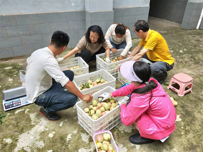 A vivid scene from the TV series Journey to the West once filled my mind—the moment when Sun Wukong was in charge of the Queen Mother's Celestial Peach Garden. The trees were laden with plump, dewy celestial peaches, glowing with a fresh, rosy hue. Several fairies, dressed in colorful, flowing silks, moved gracefully, elegantly detached from the mundane, searching and picking the celestial peaches. Little did I know, we would also have the fortune to experience such a delightful event ourselves, enjoying the pure joy of picking peaches. The Youth Homeland's back mountain boasts around 5,000 peach trees, 1,200 pear trees, 300 plum trees, and 50 loquat trees. The majority are peach trees, making it a true earthly paradise. The juicy peaches with rosy cheeks are the Baihua peaches, while the greenish, pointed ones are fragrant peaches, known for their crispy and sweet flavor. The joyful Celestials, carrying small baskets, eagerly search for the biggest, most enticing ripe peaches to pluck. After carefully selecting the best, our sales director, Dizu, along with other brothers and sisters, takes them to the market to sell.
