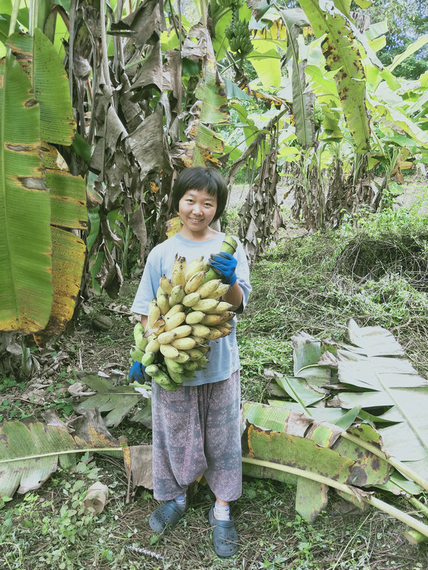 Currently, our main vegetables include papayas, banana flowers, and a continuous supply of various leafy greens. Additionally, a few previously planted eggplants are thriving and, with a bit of extra nutrition, have generously surprised us with their harvest. The vegetables we grow are entirely free of chemical fertilizers and pesticides, relying only on homemade urea, compost, and an organic liquid fertilizer (made from a mixture of banana stalks, molasses, and water). These are truly pure, organic vegetables. Some vegetables, however, are particularly attractive to pests, so we’ve taken some tips from YouTube gardening videos and started spraying a mixture of white vinegar and dish soap on the leaves of certain crops, such as using it to manually remove caterpillars from the corn leaves.