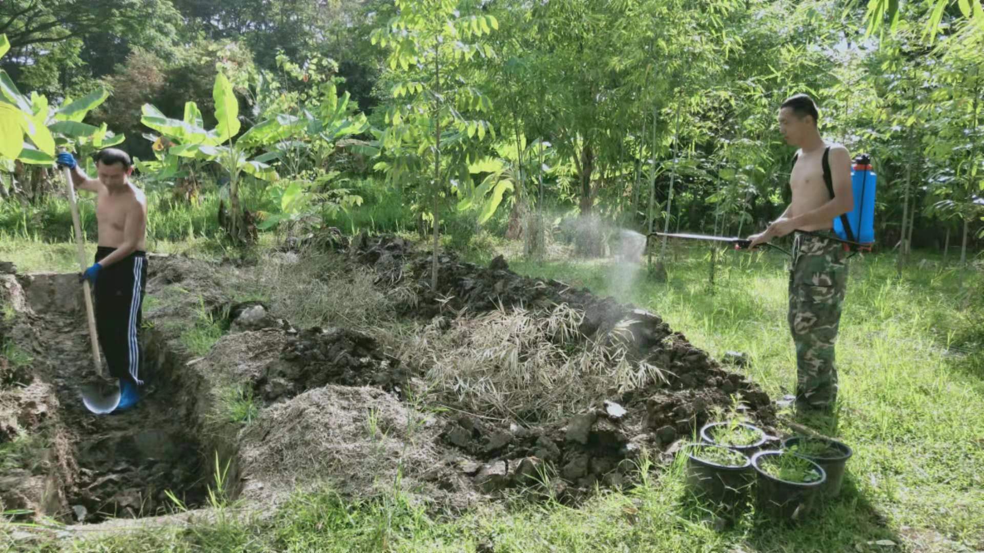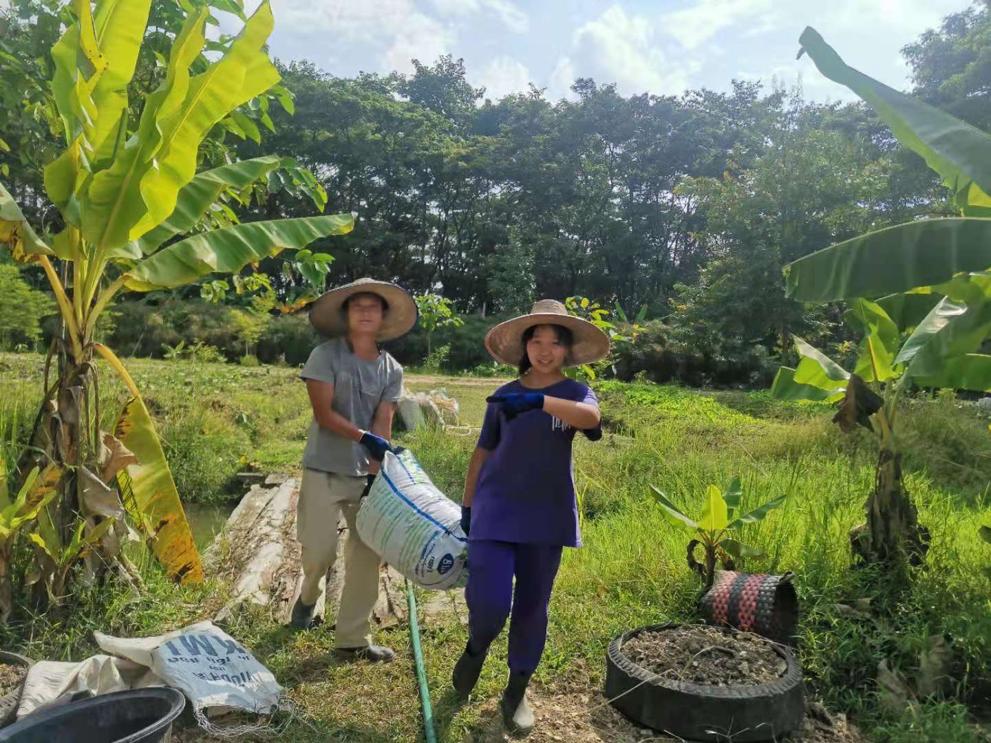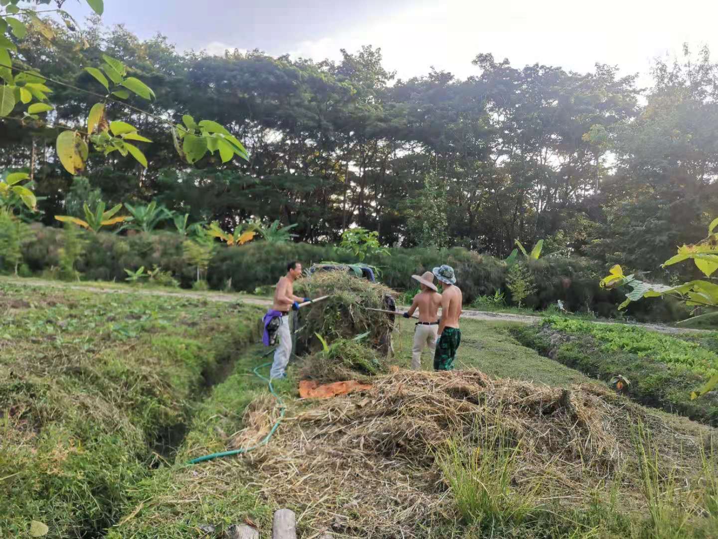During this period of time, we still concentrated our efforts on improving the soil. Faced with clay problem, everyone took it easy, rhythmically transporting fertilizers and turning over the soil, breaking the hard clods as much as possible, and mixing in a lot of organic matter. With the help of hard-working and capable brothers and sisters,three fields have been thoroughly improved. Looking at the thick and fertile vegetable beds that have been arranged, we are particularly pleased and satisfied! Sawdust and weeds were then collected, the vegetable beds were mulched, and tomatoes, radishes and sweet potatoes were planted. Daqi brother is responsible for making enzymes, and spraying em liquid on the ground with a sprayer every day to accelerate the decomposition of organic matter in the soil.